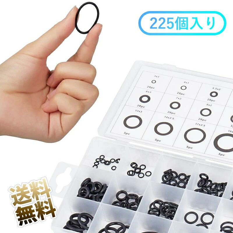 製品内容 収納ケース内に 内径×線径(単位mm):3×1=20個・4×1=20個・4.5×2=20個・5×2=20個・6×2=20個・6.5×2.5=20個・6×3=20個・7×2=20個・8×2=20個・9×2=5個・10×2=5個・12×3=5個・13×3=5個・14×2.5=5個・17×2.5=5個・18×4=5個・20×2=5個、22×2=5個 合計225個
