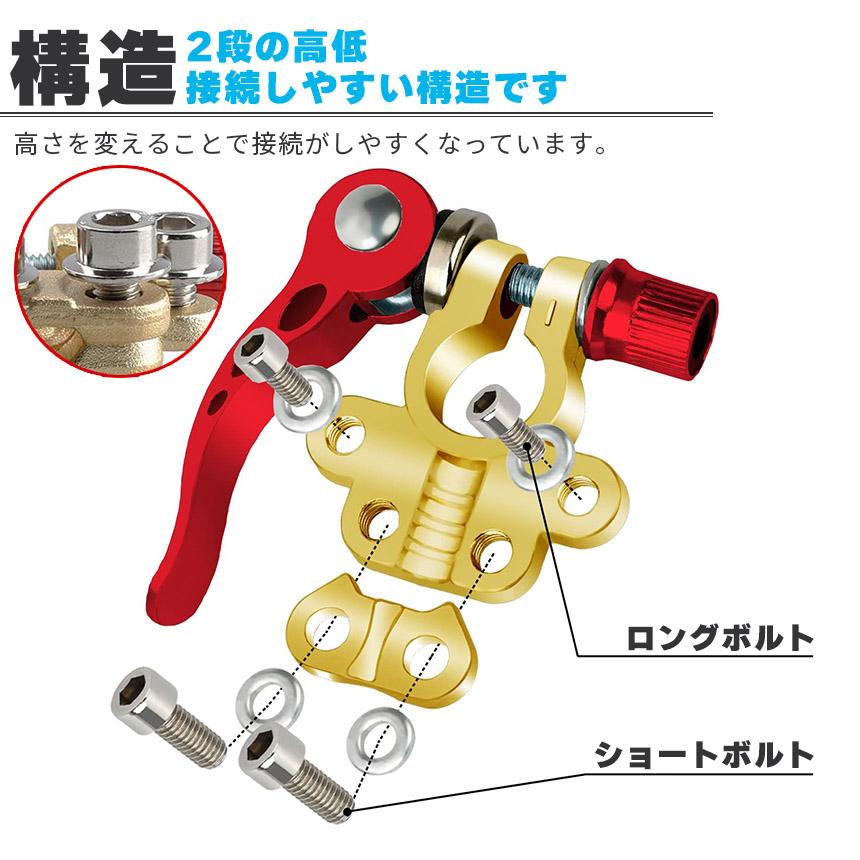 ◎複数接続できるバッテリーターミナル◎【特徴】導電性、耐食性に優れた亜鉛合金とメッキ銅でできていて、電圧の歪みや伝送の損失を低減できます。耐久性もよくタフにご使用できます。【機能】複数のケーブルを接続するための、特別設計された4つの端子があり、高さを変えることにより接続しやすくなっています。また、付属の六角レンチで簡単に接続でき、全体を外すときはクイックリリース式で簡単着脱できます。【サイズと詳細】・1セット内容ターミナルx2、ワッシャーx2、L字六角レンチx1・サイズ約65x60x25mm、88g
