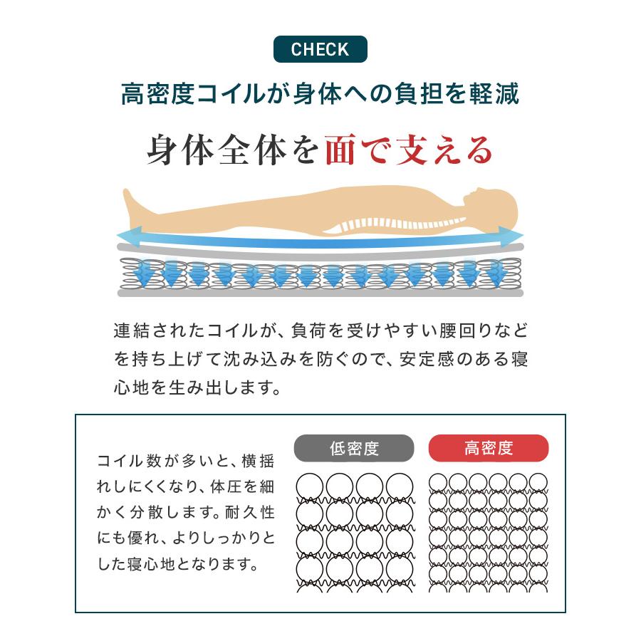 身体を面で支え、体にかかる負荷を分散させるので、肩や腰の沈み込みを防ぎ、安定感のある寝心地です。