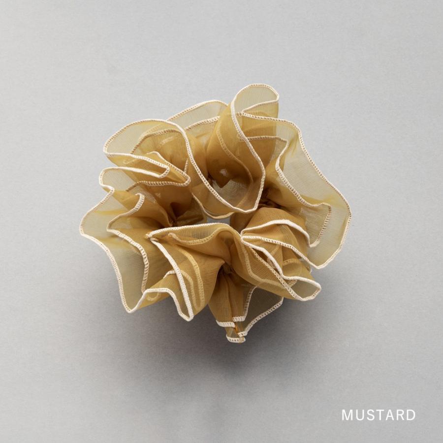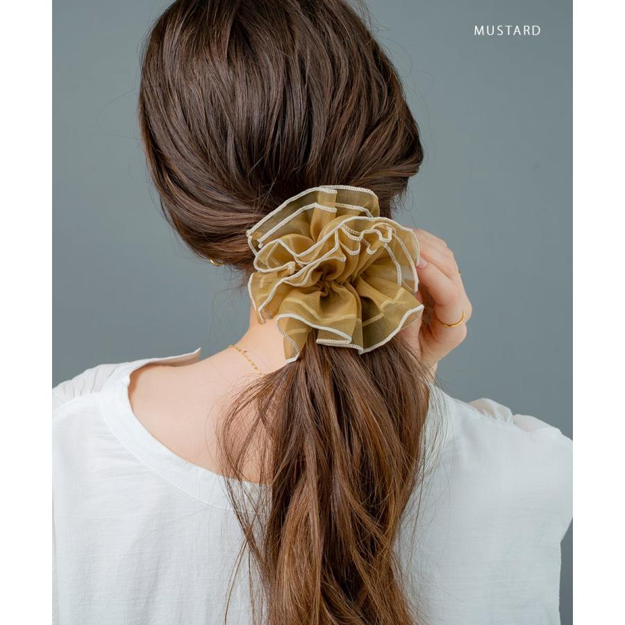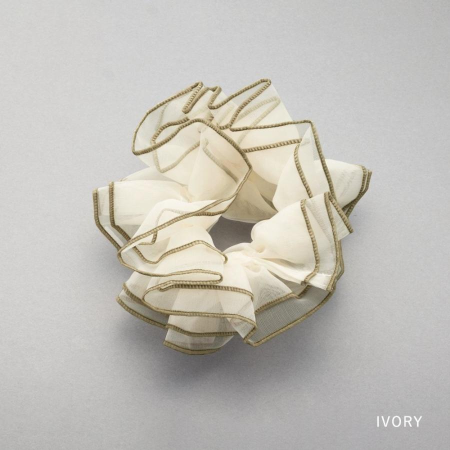 やわらかに透けるオーガンジーに、くっきりと縁を描くパイピングがこなれ感を演出。甘さの中に大人っぽさをひとさじ加えた、ほどよい存在感のシュシュです。