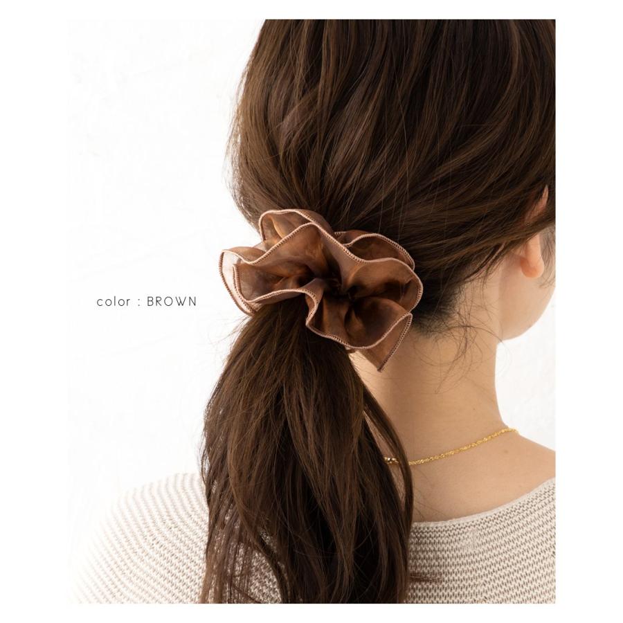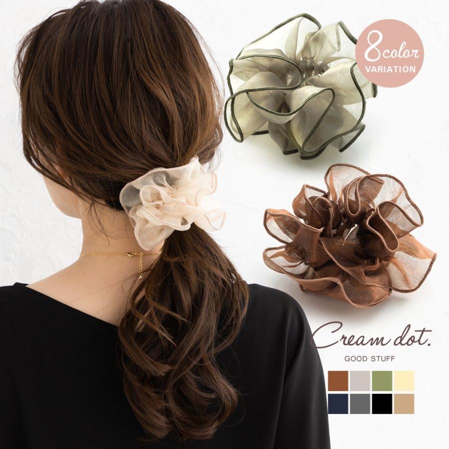 上品な透け感のオーガンジー生地にメリハリパイピングを施した大人可愛いシアーオーガンジーシュシュ。程よく広がるボリューム感で女性らしく華やかに仕上がります。デイリーは勿論、ドレスアップスタイルにも◎