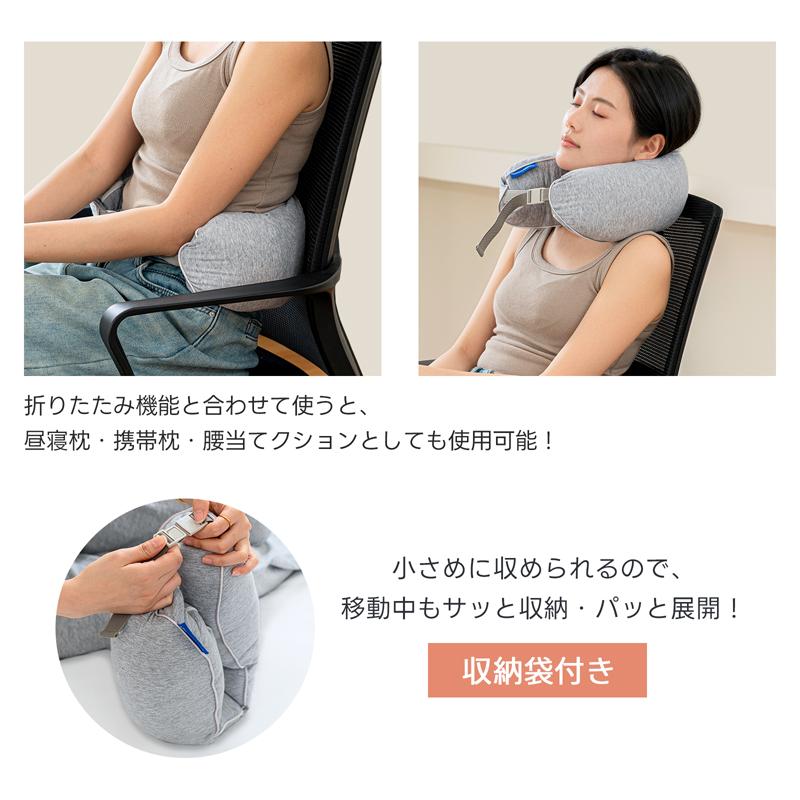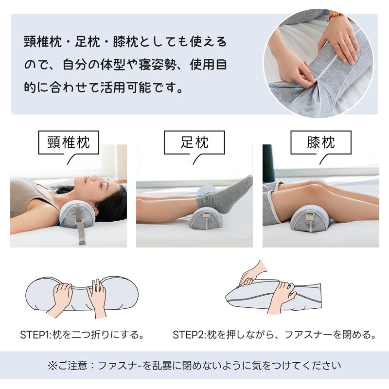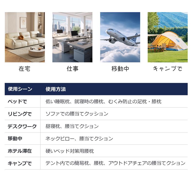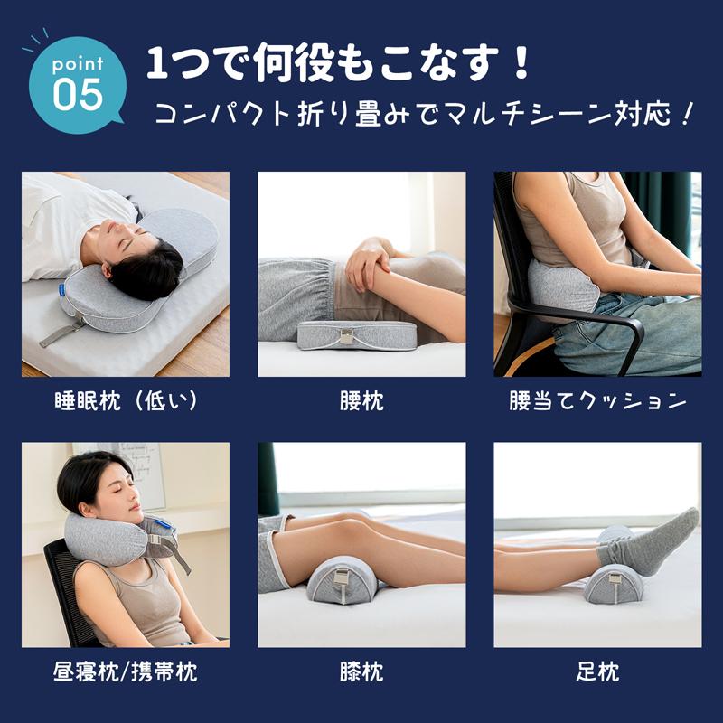 広げれば低い睡眠枕・就寝用腰枕として活躍。折りたためば、デスクチェアの腰サポートに、ソファでの腰当てクッションに、寝る時の足枕や膝枕として、さらに飛行機や新幹線ではネックピローに早変わり!1つ持てば7役の使い分けが可能な便利アイテムです。