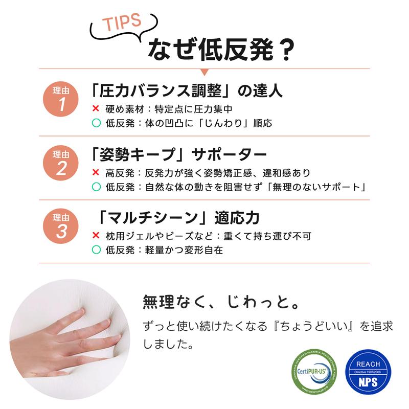 低反発腰枕で、圧力が一箇所に集中せず、違和感なく腰をやさしくサポート。