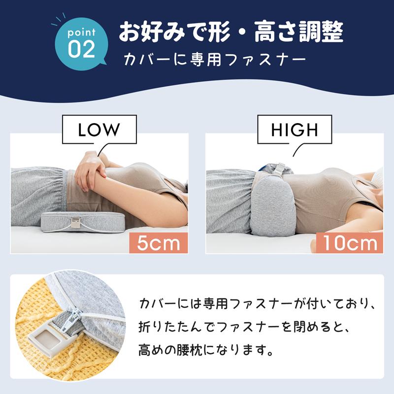 折りたたむと高めの腰まくらに早変わり。低め5cmから高め10cmまで、腰のカーブに合わせて調整可能。