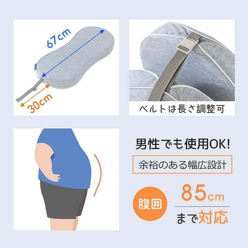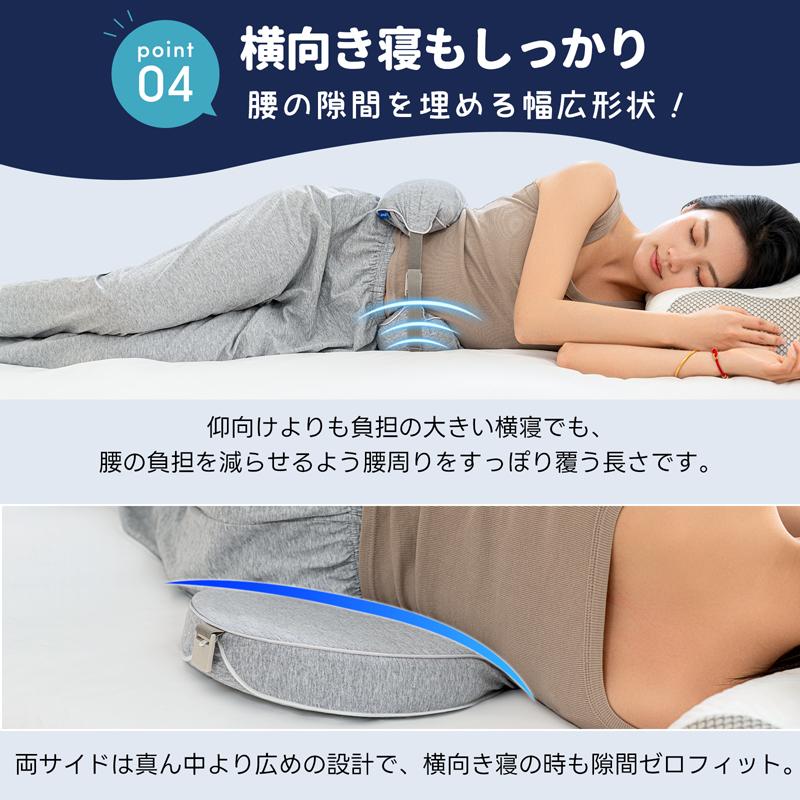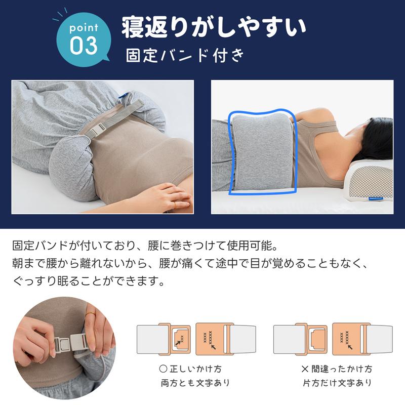 固定バンド付きで腰に巻きつけて使用可能な腰マクラです。寝返りを打っても安定したまま安眠をサポートします。