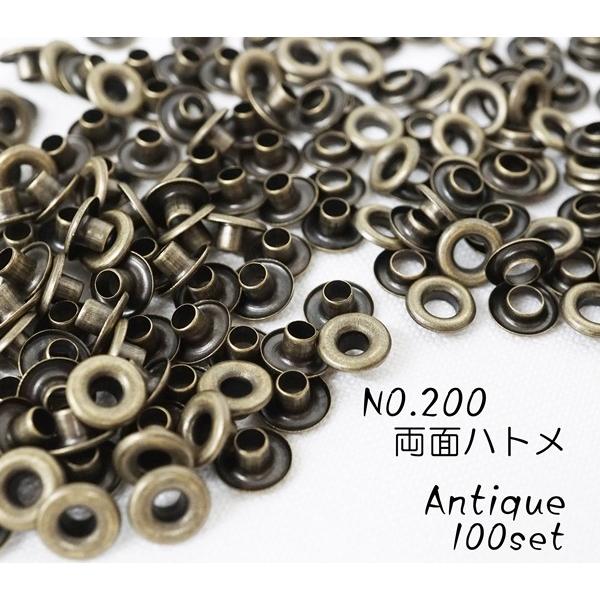 〇素材 真鍮〇カラー アンティーク(AG)〇サイズ 内径3mm 外径8mm 足3×3.6mm (写真を参照)〇個数 100個内径3mmの日本製の両面ハトメです。お得な100個セットです。ポーチや小物などレザークラフト、ハンドメイドにぜひお使い下さいませ。※NO.200番(両面)の打ち具が必要になります。ご確認の上、お買い求め下さいませ。※専用打ち具も販売しています。