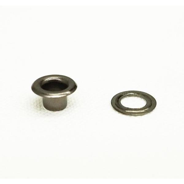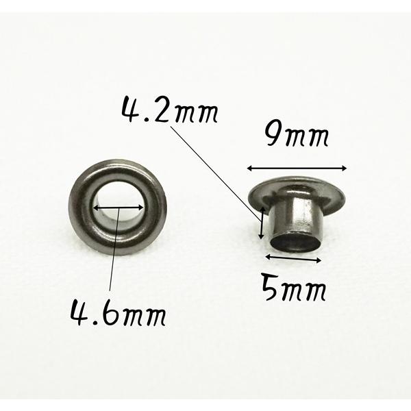 〇素材 真鍮〇カラー ブラック(黒ニッケル)〇サイズ 内径4.6mm 直径9mm 足4.2×5mm (写真を参照)〇個数 100個 (座付)日本製のNO.300番、片面ハトメです。お得な100個セットです。小物などレザーアイテムにぜひお使い下さいませ。※NO.300番(片面,丸潰し)の打ち具が必要になります。ご確認の上、お買い求め下さいませ。(専用打ち具も販売しています)