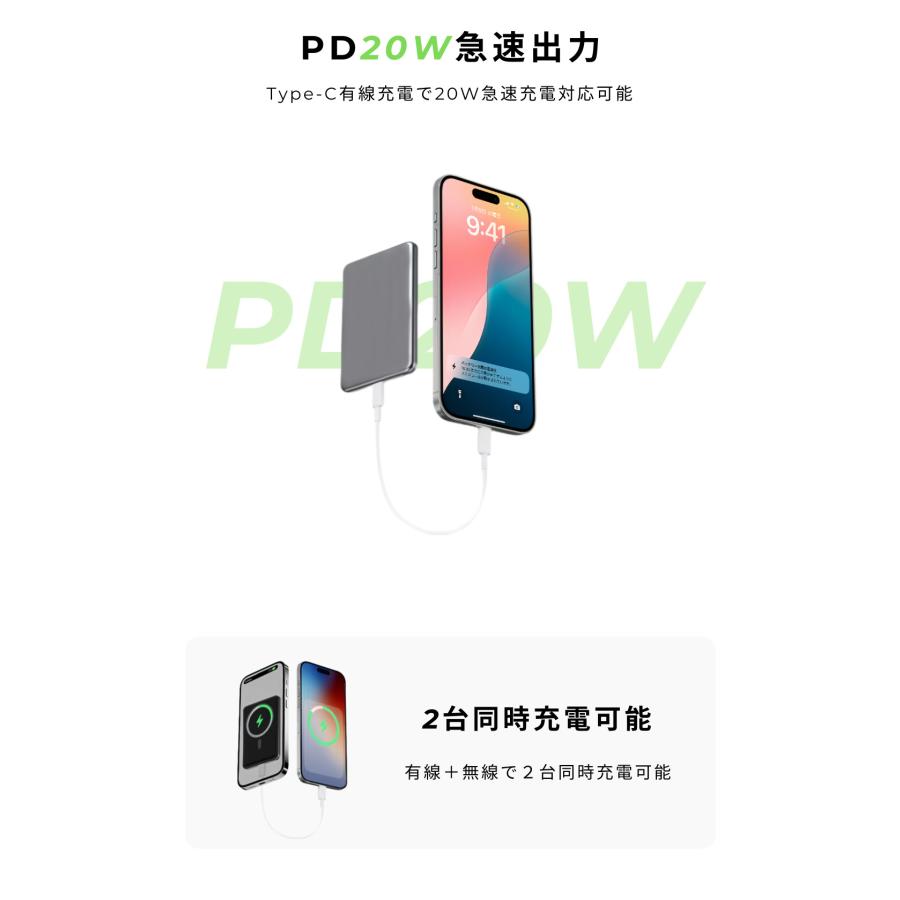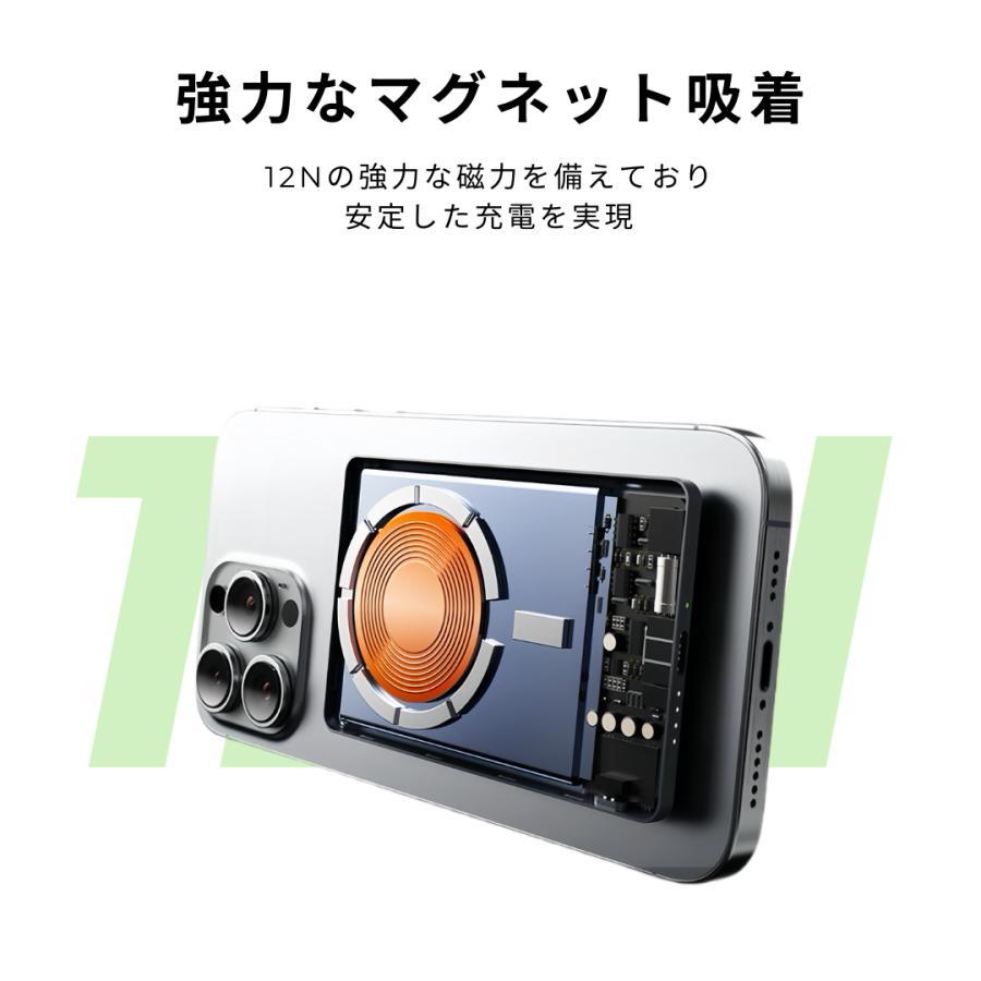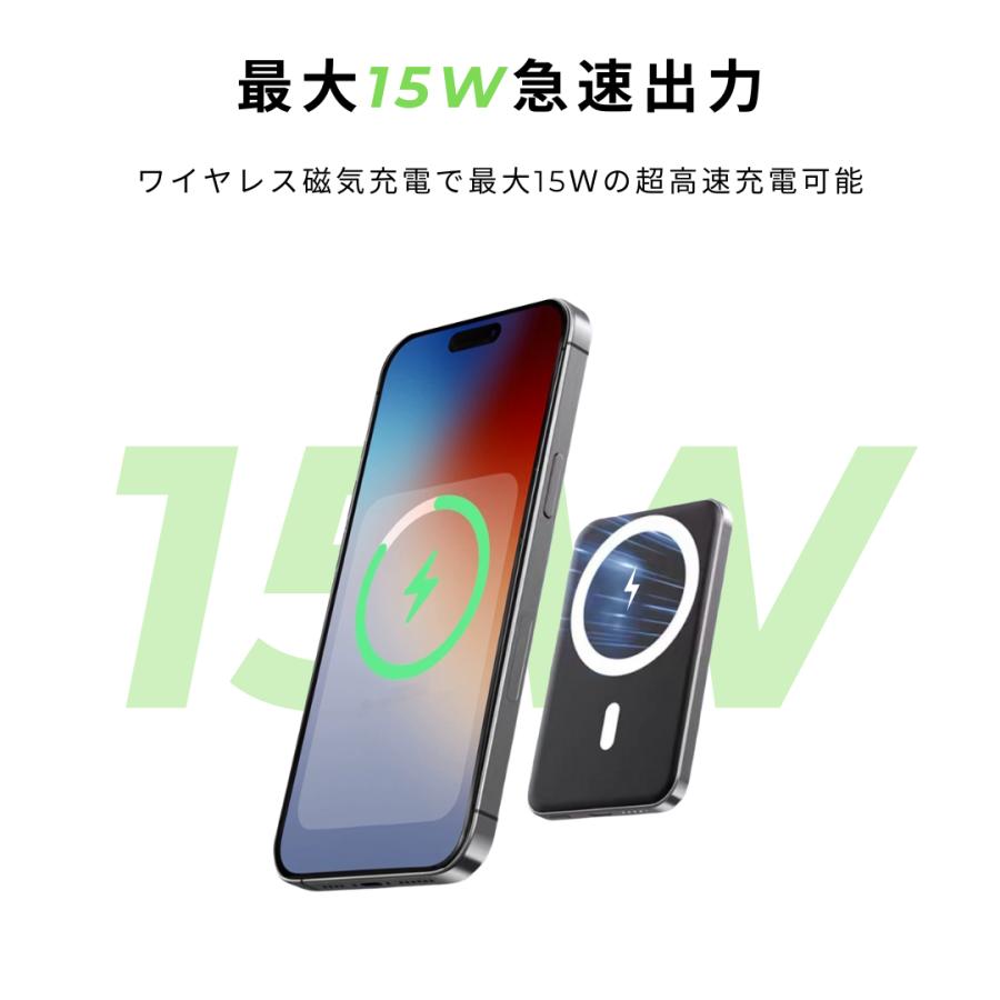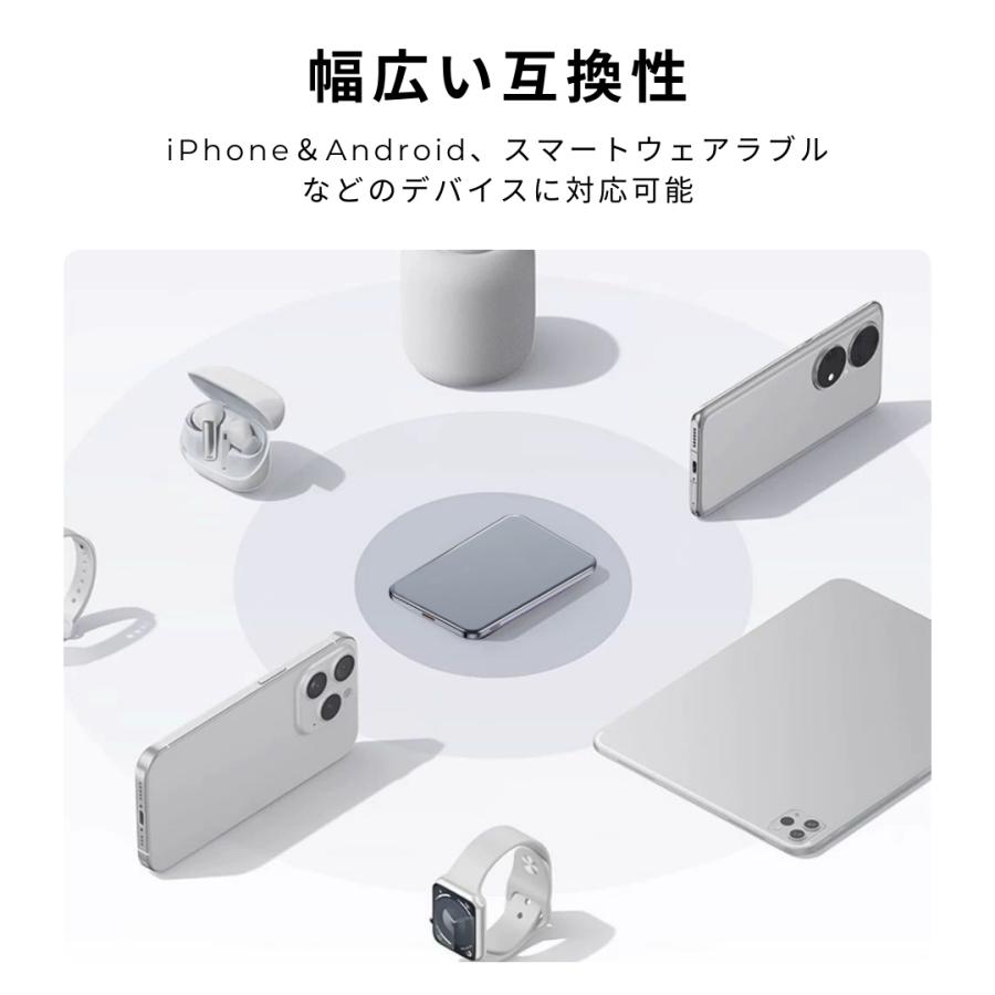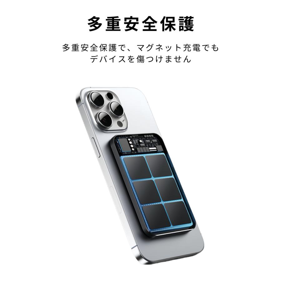 ワイヤレスモバイルバッテリーは、先進のMagSafe技術を採用し、薄型ながらも強力なマグネットを内蔵しています。煩わしいケーブルなしで、デバイスにピタッとくっつけるだけで充電開始。ボタン操作も不要で、3秒以内に自動的に充電します。(注:MagsafeはiPhone12/13/14/15/16シリーズに最適ですが、他の機種はMagsafe対応ケースが必要です。