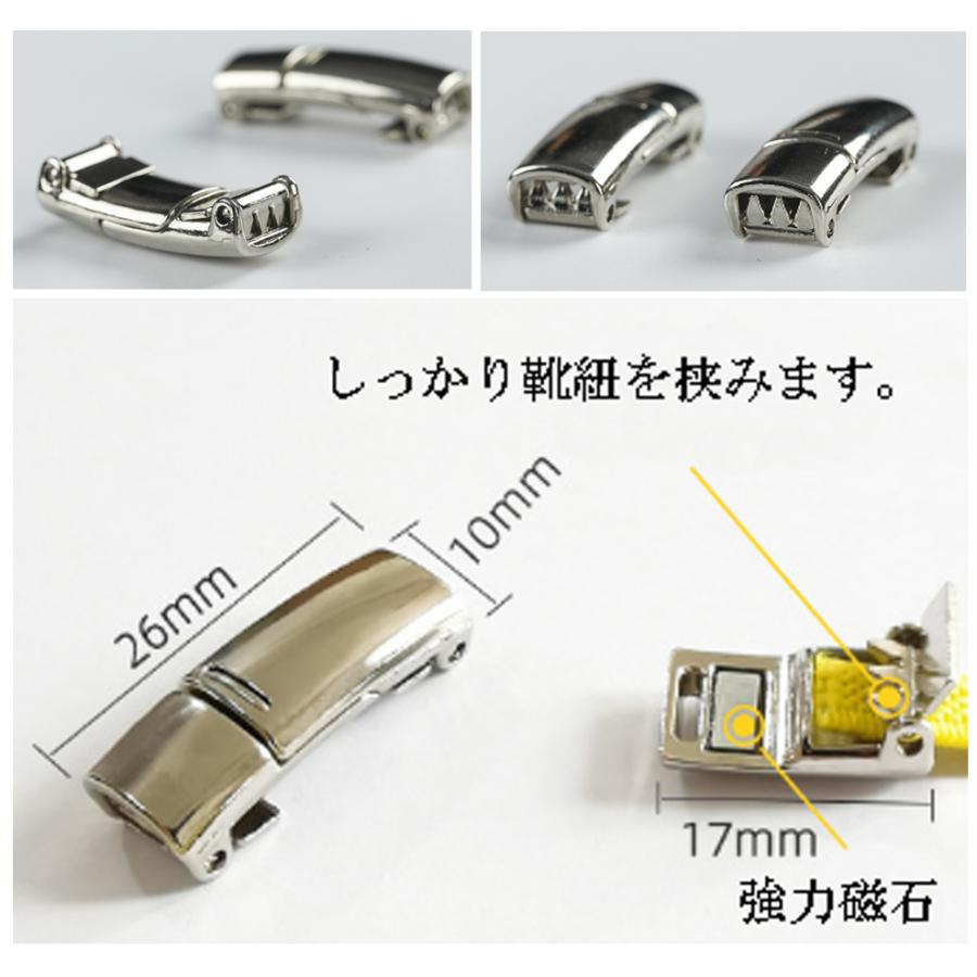 セット内容:磁石マグネットパーツ2個(両足用)靴紐サイズは幅6mm厚み1.5mmまで取り付け可能