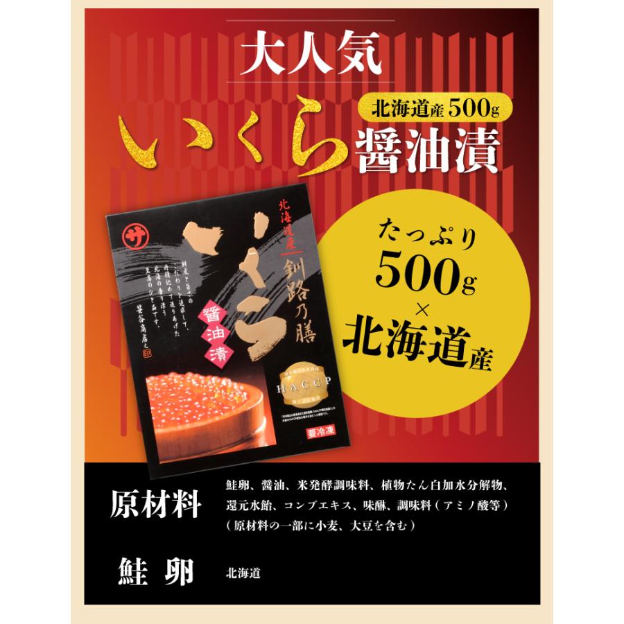 商品名:いくら醤油漬 500g 5〜6人前加工地:北海道 / 産地:北海道原材料:鮭卵(北海道)、醤油、米発酵調味料、植物たん白加水分解物、還元水飴、コンブエキス、味醂、調味料(アミノ酸等)<br/>※原材料の一部に小麦、大豆、いくらを含む賞味期限:ご家庭の冷凍庫で1ヶ月程度が目安です【要冷凍-18℃以下】配送方法:送料無料 ※北海道・沖縄県へのお届けは別途660円頂戴いたします。 ポイント利用