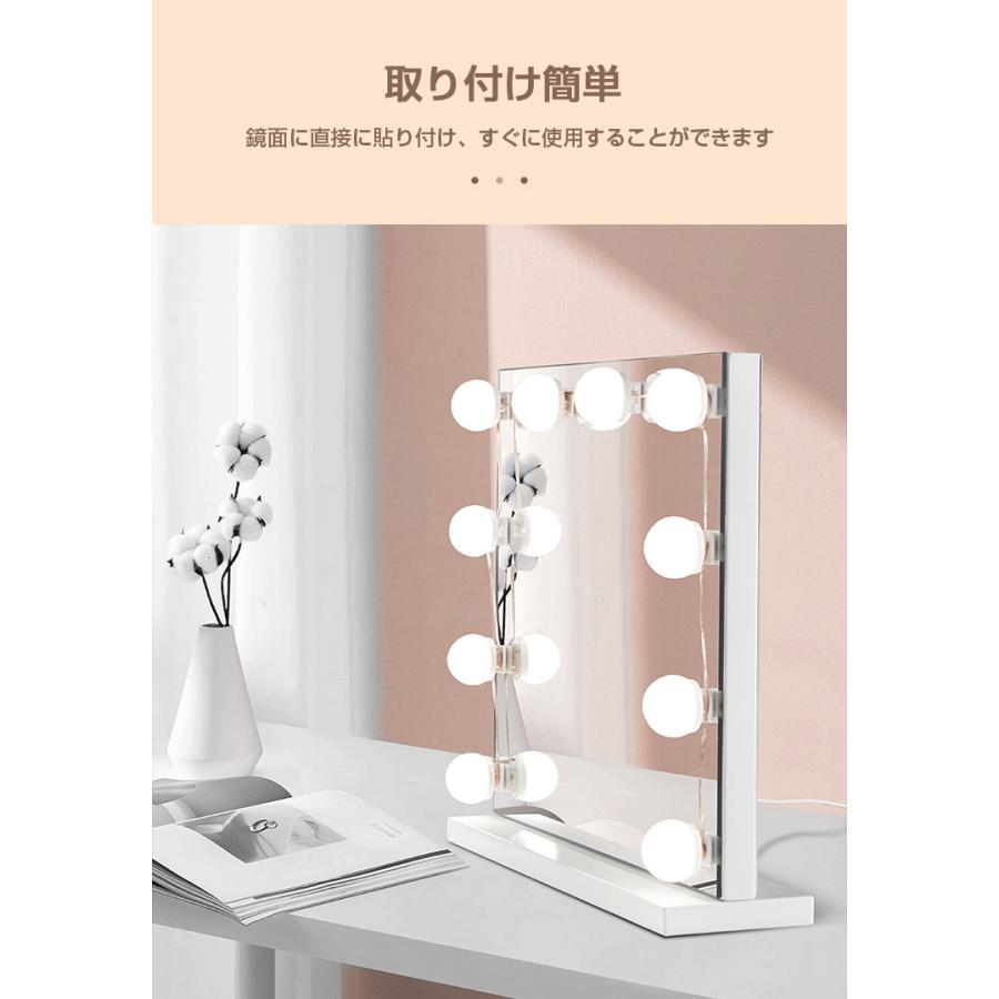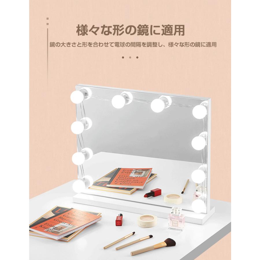 両面テープ/吸盤を電球に貼り付けてから、電球を回して好きな長さを調整して、鏡に貼り付けます、そして電源を入れると完成します。化粧鏡、更衣室、美容室などいろんな場所で適用られます。結婚式、誕生日パーティー、店のショーウインドー、寝室、バー、レストランLEDライトとしても完璧です。