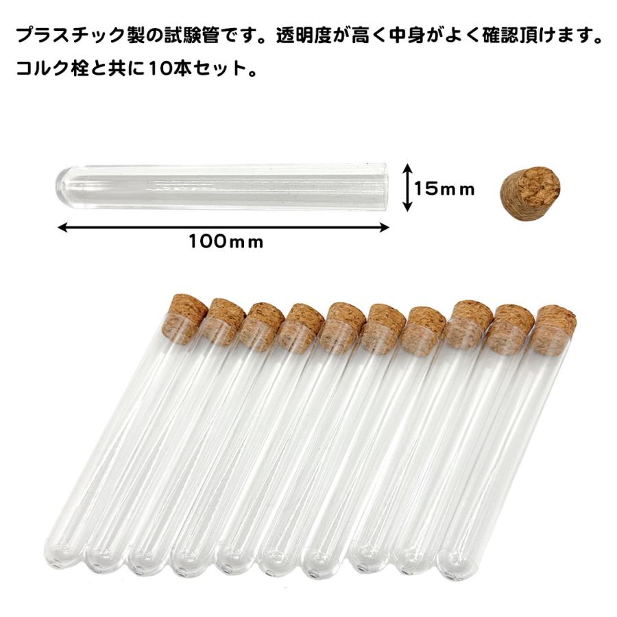 ・さまざまな用途に使用できる、プラスチック製試験管10本セットです。・蓋として、コルク栓が付属しております。・お子様の実験などのお供に、また、サンプルの保存(ビーズ、御香、砂等)などにどうぞ・サイズ:長さ:10cm×幅1.5cm・容量:おおよそ15ml(メモリは記載されておりません)※当商品はプラスチック製ですので、薬品等を入れてのご使用は大変危険となります。お控えください。