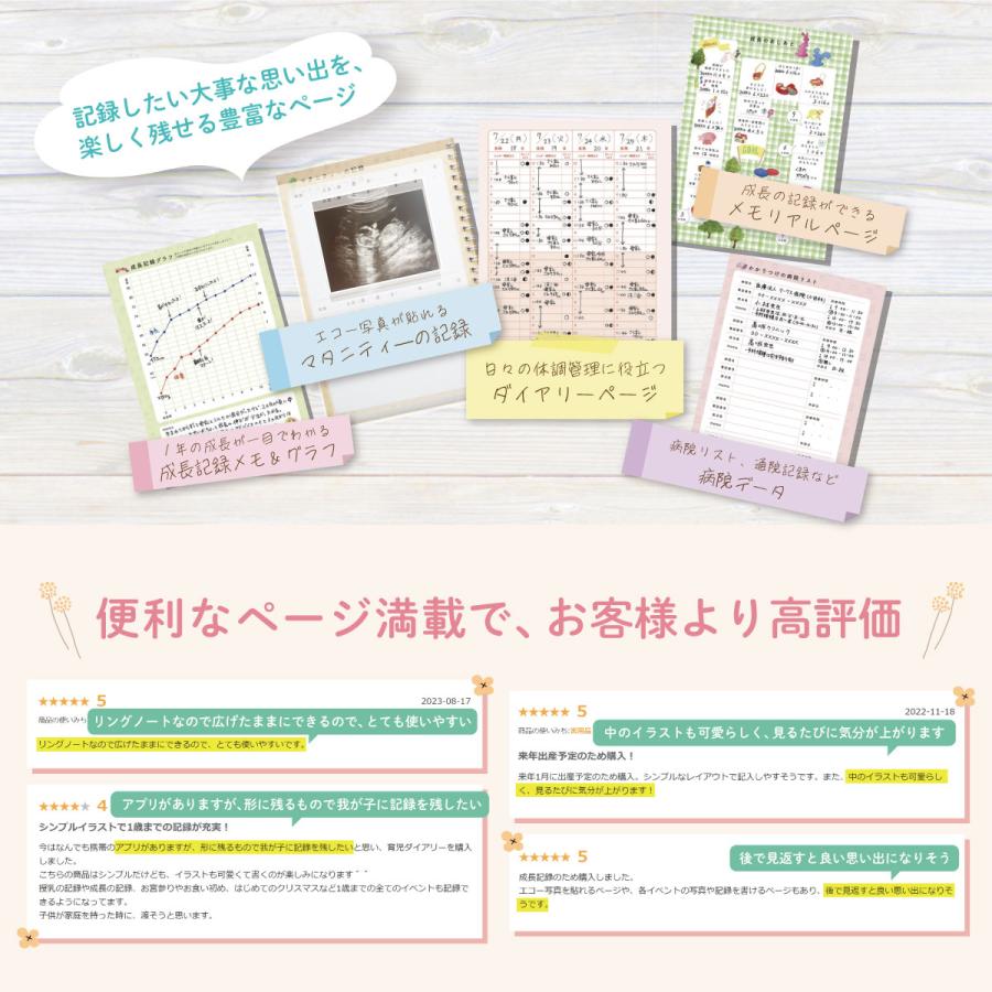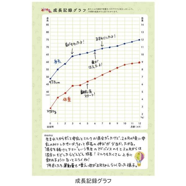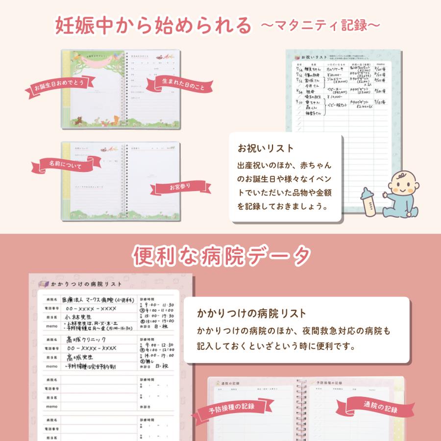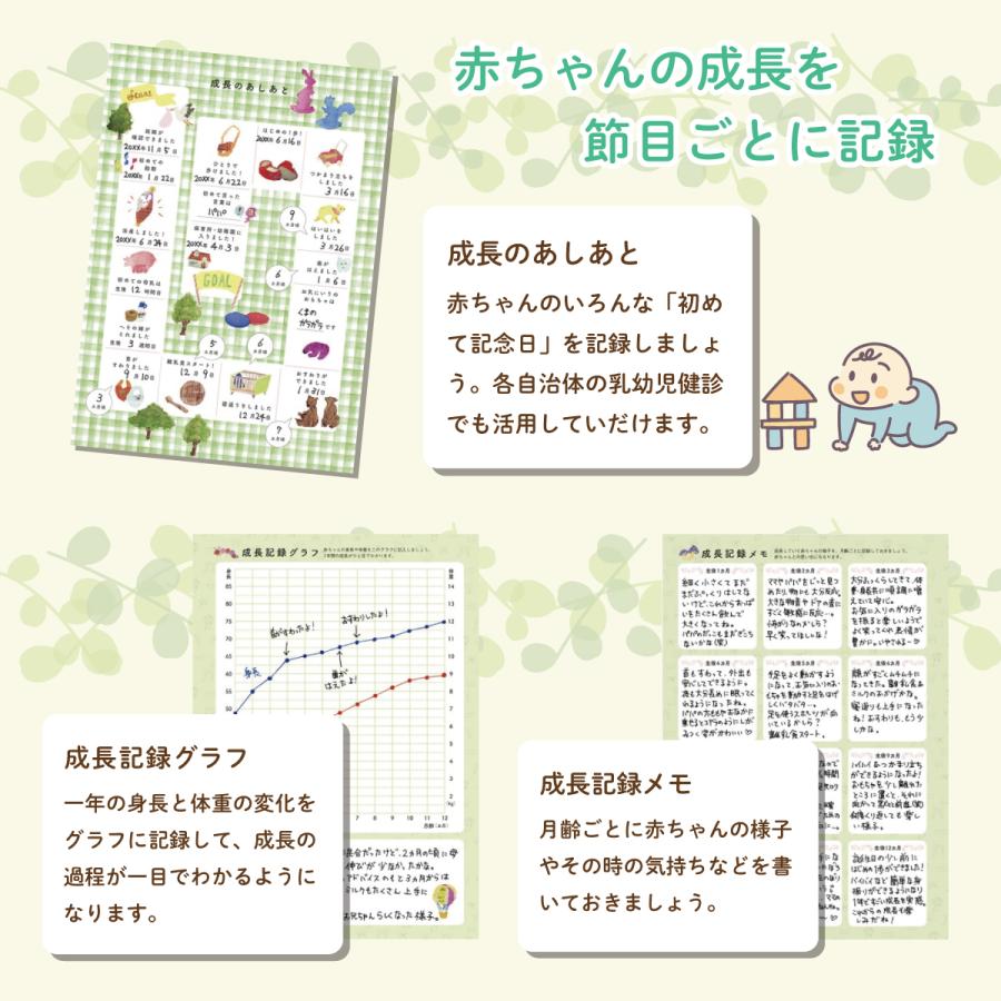 誕生から1歳になるまでの成長記録に加え、赤ちゃんとの思い出を楽しく残せるページも付いています。