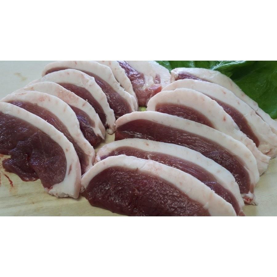 国産合鴨ロース特上焼き肉用カット300g鍋用スライスより厚めにカット。焼き脂付き。瞬間凍結なので赤身が白く見えますが解凍すると元の色(赤)に戻ります。賞味期限は2か月設定です。ミディアムレアくらいの焼きでお召し上がりください。網焼きすると脂が落ちて燃えます!