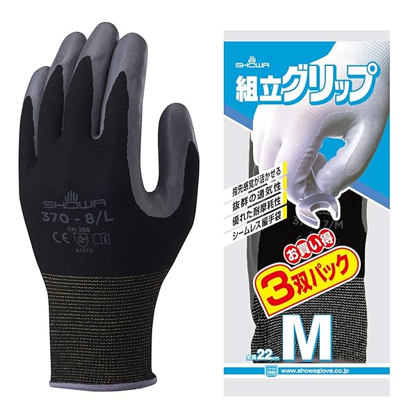 ショーワグローブ 【3双パック・ニトリル背抜き手袋】No.370 組立グリップ ブラック Mサイズ