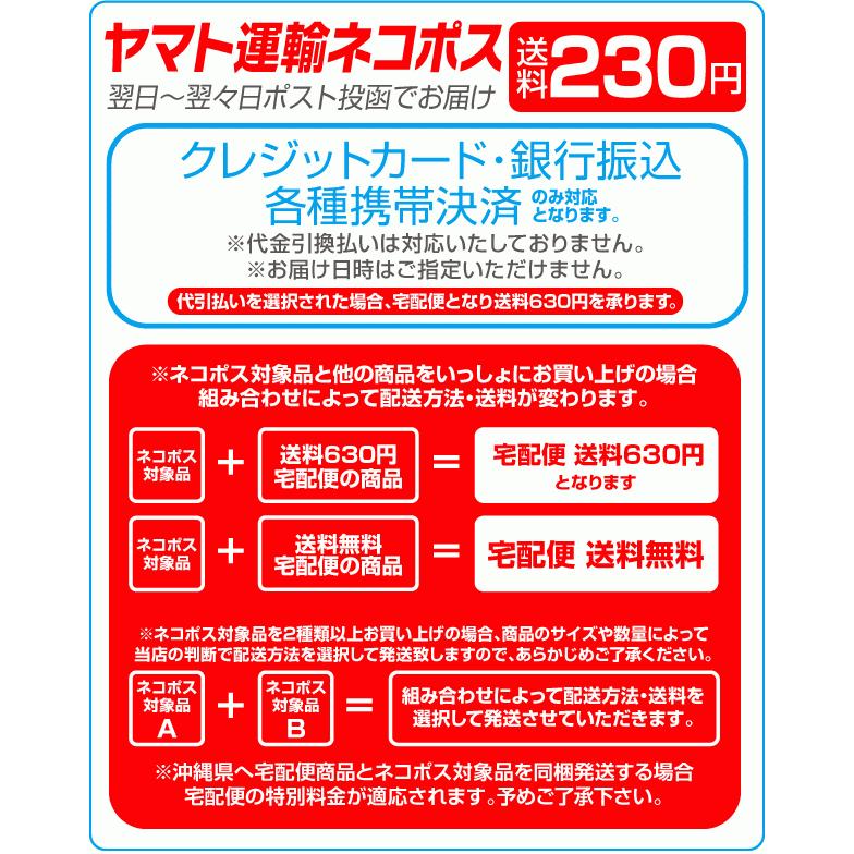 ・ネコポス対象商品2点以上お買い上げの場合、ご購入数・組み合わせによっては宅配便(¥630)になる場合がございます。ご注文確定時の送料をご確認いただき、お手続きくださいませ。