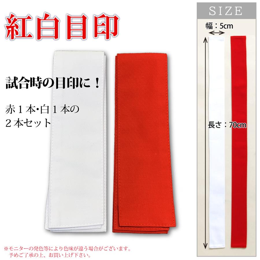 剣道 紅白目印 剣道たすき(赤1枚・白1枚セット)【内容】紅白目印2本入り(紅×1、白×1)【サイズ】幅:5cm 長さ:70cm※こちらの商品はメール便(追跡番号有り)となります。お急ぎの方は宅配便をお選び下さい。