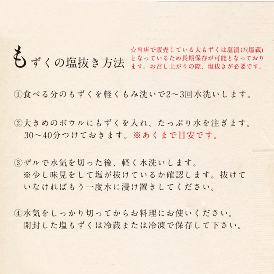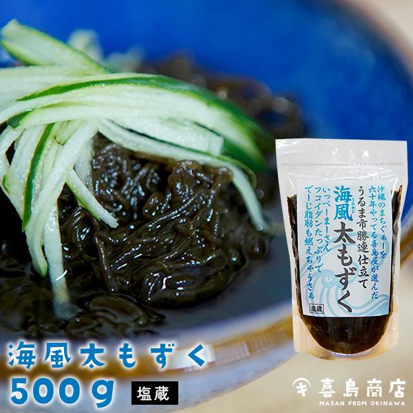 ■名称 もずく■内容量 500g■原材料名 もずく(沖縄県うるま市勝連産) 、塩■賞味期限 枠外記載■保存方法 直射日光、高温多湿を避け常温、冷暗所にて保存してください。開封後は冷蔵にて保存し、なるべく早くお召し上がり下さい。長期保存の場合は開封前後にかかわらず、冷凍保存して下さい。■製造者 株式会社 喜島屋 沖縄県那覇市桶川1-4-29 1F■配送方法 この商品は通常便です。