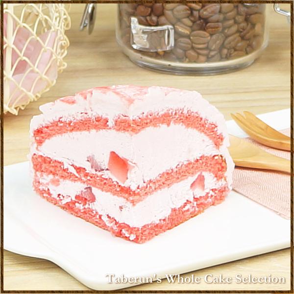 ピンク色の姿が、非常に可愛らしいこのケーキ。その色の正体は、もちろん、いちごです。いちごの果肉、クリーム、そして生地にもいちごを使用した、まさに、いちごづくしのケーキです。