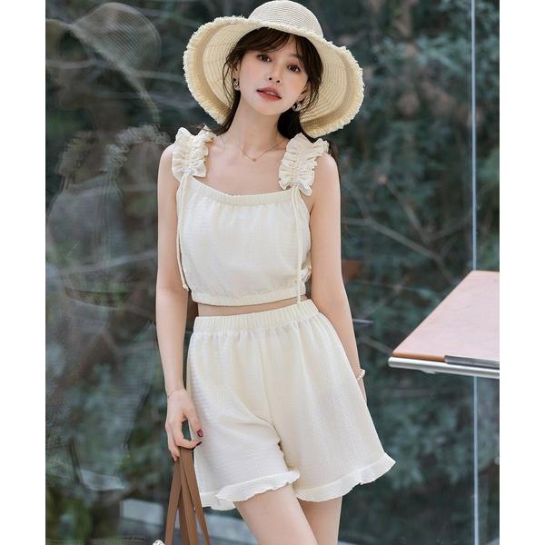 商品名:レディース水着 ギャザーフリルハイウエストビキニ+ショートパンツ 3点セット