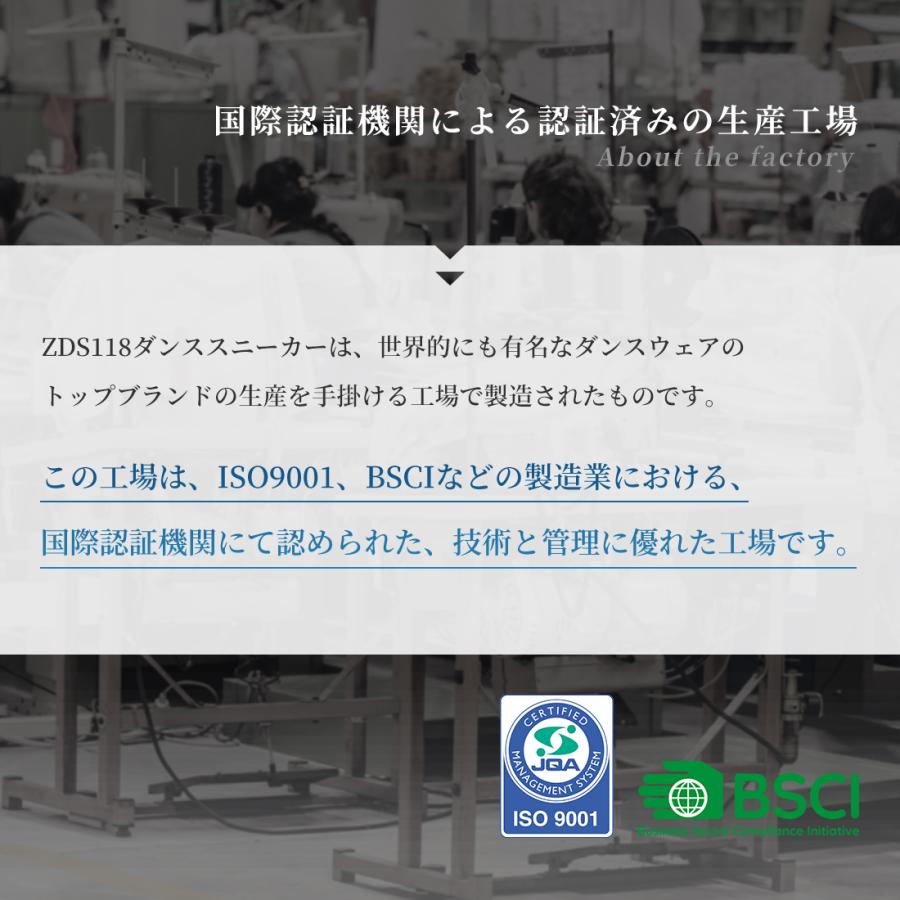・ISO9001、BSCIなど生産技術と管理における国際認証機関にて認められた技術と管理に優れた工場での生産しています。ダンスシューズトップブランドのアイテムも製造している安心の工場です。