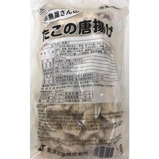 ベトナム産イワダコを使用。調理の際にゆるんでもベトつきにくく、扱いやすくなっています。時間が足っても衣の食感が残り、お惣菜にも最適です。内容量:1kg 原産国:ベトナム 原材料:たこ(ベトナム産)、卵白粉(卵を含む)、食塩、衣(でん粉、クラッカー粉(小麦を含む)、香辛料、食塩、粉末醤油(小麦・大豆を含む)、砂糖、卵白粉(卵そ含む)大豆粉、酵母エキス粉末、植物性たん白(小麦を含む)/加工でん粉、調味料(アミノ酸等)、PH調整剤、増粘多糖類、貝カルシウム
