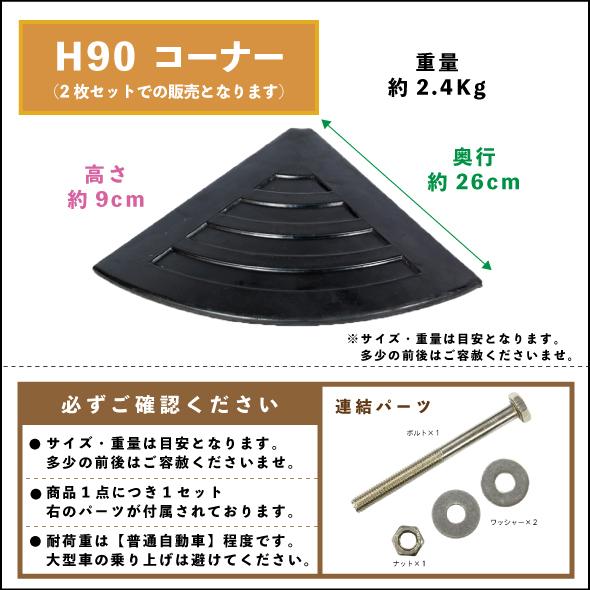 H90コーナー×2枚セットでの販売となります。プラスチック製品に比べて丈夫で耐久性があり横からの乗り上げショックに強く滑りにくい材質とデザインです。【サイズ】(約)横幅26cm 奥行26cm 高さ9cm【重量】(約)2.4kg【材質】硬質ゴム【耐荷重】普通自動車程度★連結用ボルト・ナット付★【別途送料地域】北海道・沖縄・離島は、1セットにつき300円の送料を加算させていただきます。【返品不可】未使用の場合でも商品不良以外の返品はお受けできません。