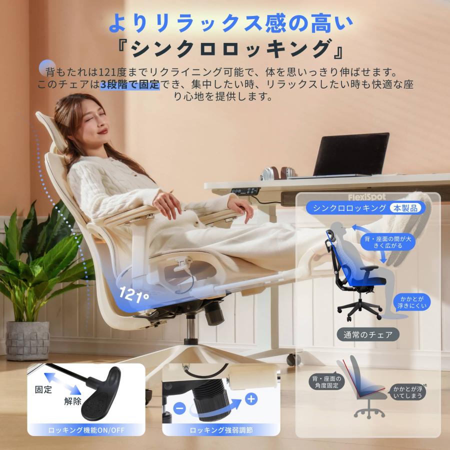・シンクロロッキング機能:背もたれと座面が連動して傾くシンクロロッキング機能を搭載。体にフィットしながら自然に伸び、長時間のデスクワークによる疲労を軽減。