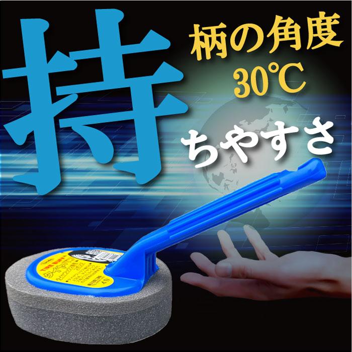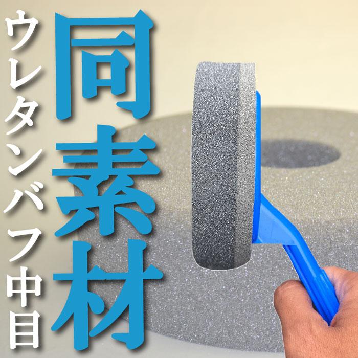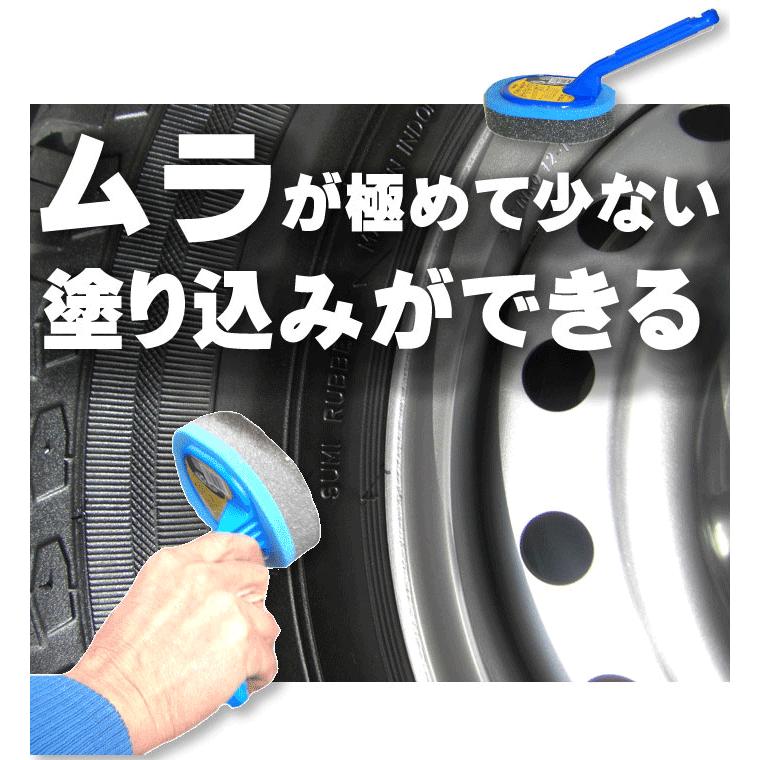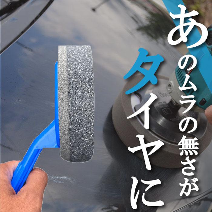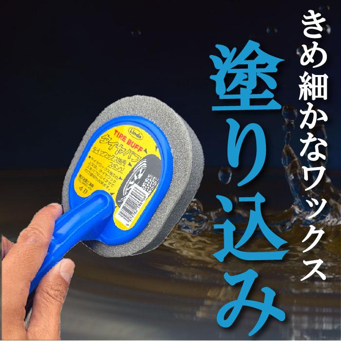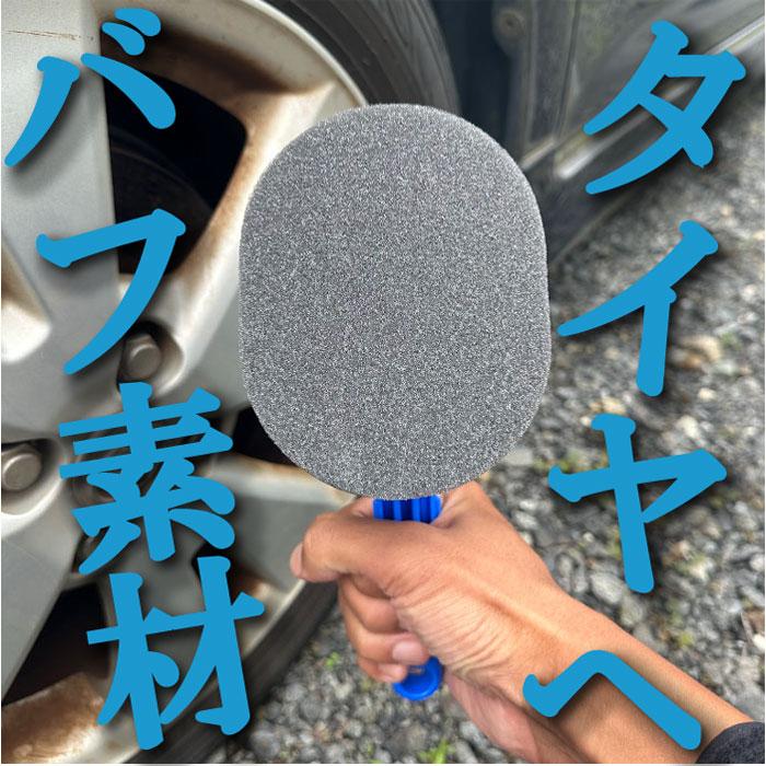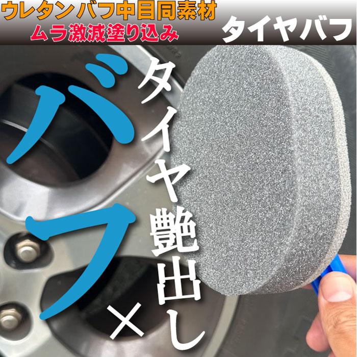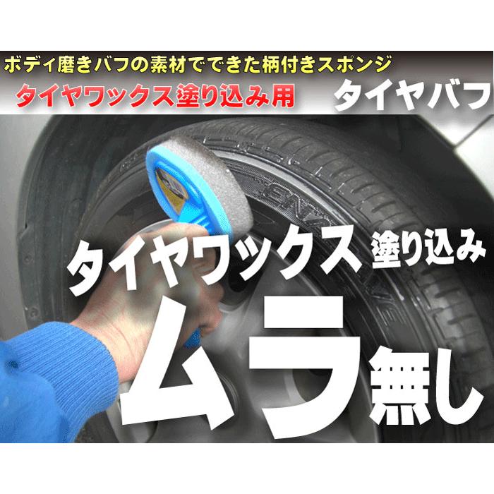 タイヤワックス塗布専用の柄付きのスポンジバフです。タイヤワックスをタイヤ表面にムラなくキレイに施す事ができます。その秘密は、タイヤバフの素材。タイヤバフの表面はボディ磨きバフのウレタンバフ中目の素材でできています。ボディ磨きバフは、コンパウンドやコーティング剤をムラなくキレイに施せるように開発されたもの。このボディ磨きバフの能力がそのままタイヤに施すタイヤワックス施工に使えるのです。これにより、一般的なタイヤワックス用のスポンジに比べて、ムラのないハイレベルなタイヤワックス施工ができます。さらに、柄がついていますので作業時に手が汚れる心配がなく、作業性にも優れています。この柄の角度にもこだわって設計されており、疲れにくい角度の30度になっています。水性タイヤワックスでも、油性タイヤワックスでも使用可能なので、タイヤワックス塗り込みなら様々な要因からタイヤバフを使う事をおすすめします。