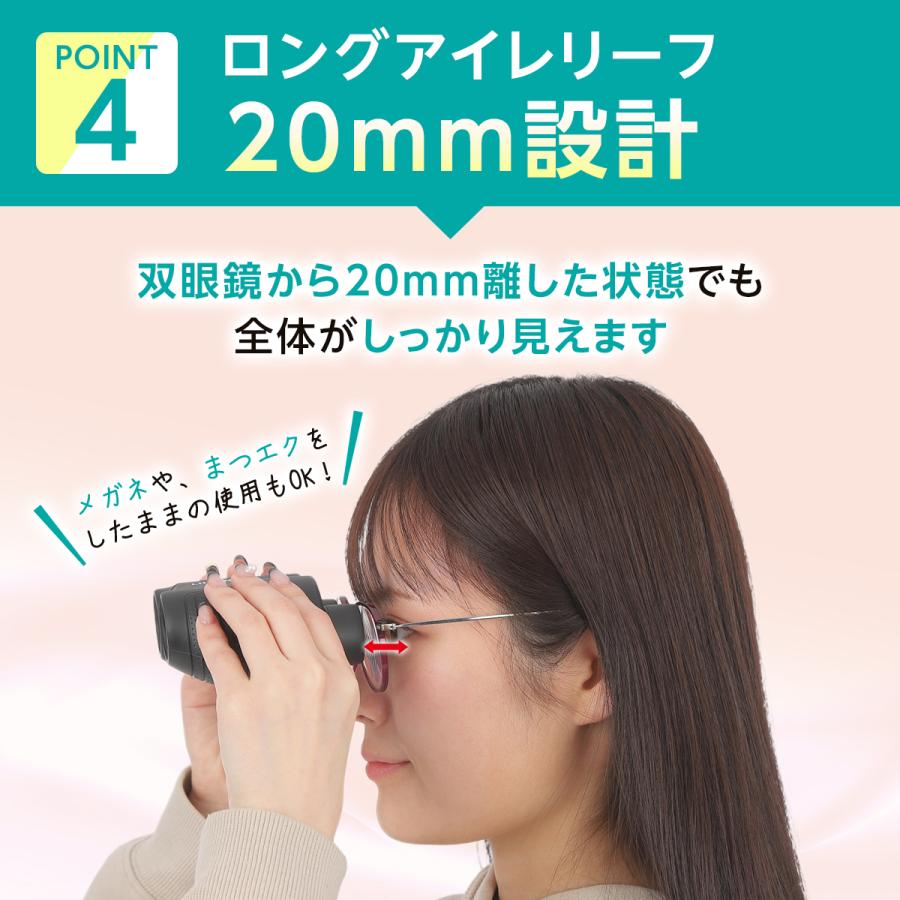 目とレンズの距離を配慮した20mmのアイレリーフにより、メガネをかけたままでも快適に使用できます。これ一つで、コンサートからスポーツ観戦、バードウォッチングまで幅広く楽しむことができます。