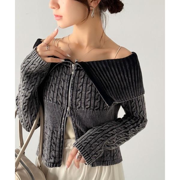 商品名:【mily bilet】大活躍間違いなし♪綿100%ダブルジップストーンウォッシュオフショル2WAYケーブルニット(ショート丈)