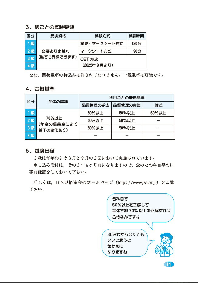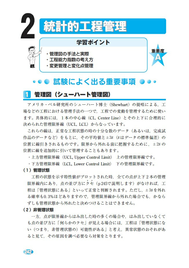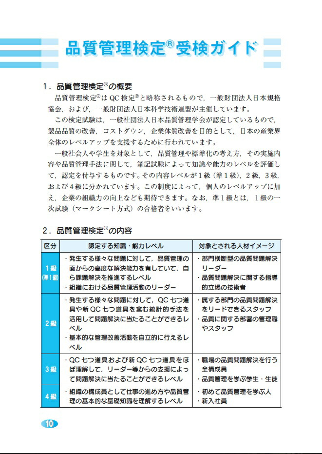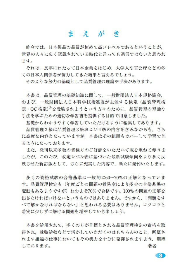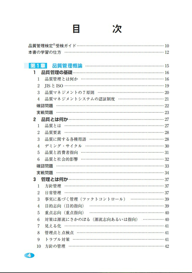 第1章 品質管理概論(品質管理の基礎/品質とは何か)/管理とは何か/標準化/第2章 品質管理の手法(データの採り方/QC七つ道具 ほか)/第3章 品質管理の実践(製品検査および信頼性/統計的工程管理 ほか)/第4章 模擬問題と解答解説(模擬問題/模擬問題の解答 ほか)