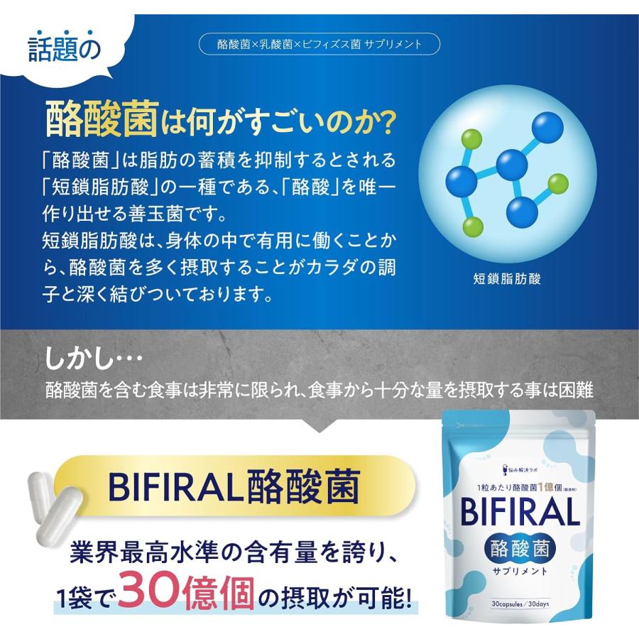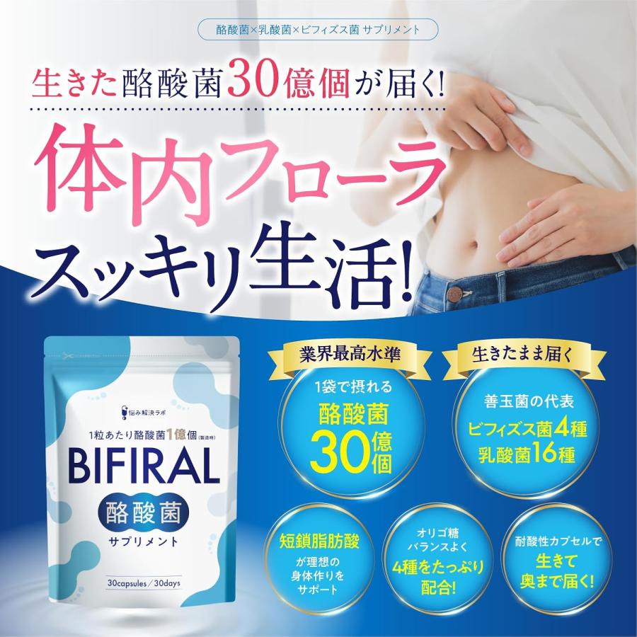 ・【1袋で30億個の生きた酪酸菌が届く】BIFRAL酪酸菌サプリメントは、酪酸菌・乳酸菌・ビフィズス菌・オリゴ糖を贅沢配合し、1日1粒で体内フローラすっきり生活をサポート。
