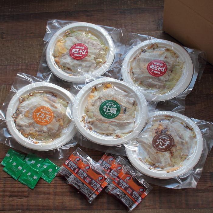 ■内容量:5枚入り(肉玉そば×2枚、牡蠣入り×1枚、穴子入り×1枚、いか天入り×1枚)