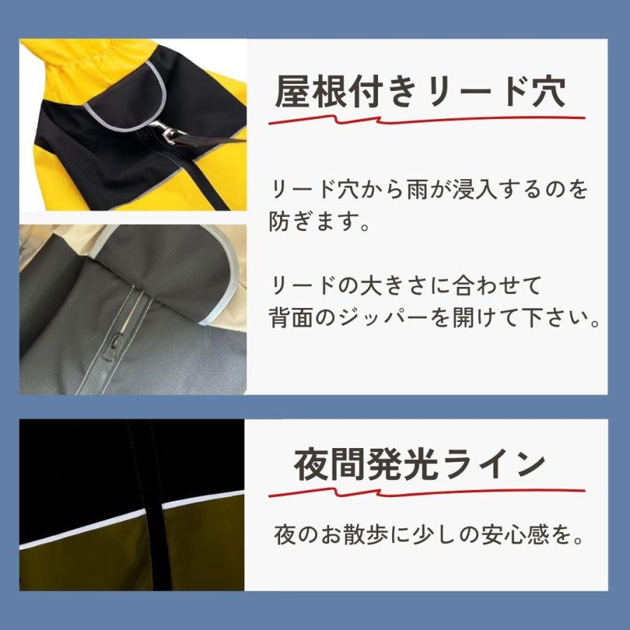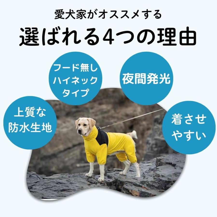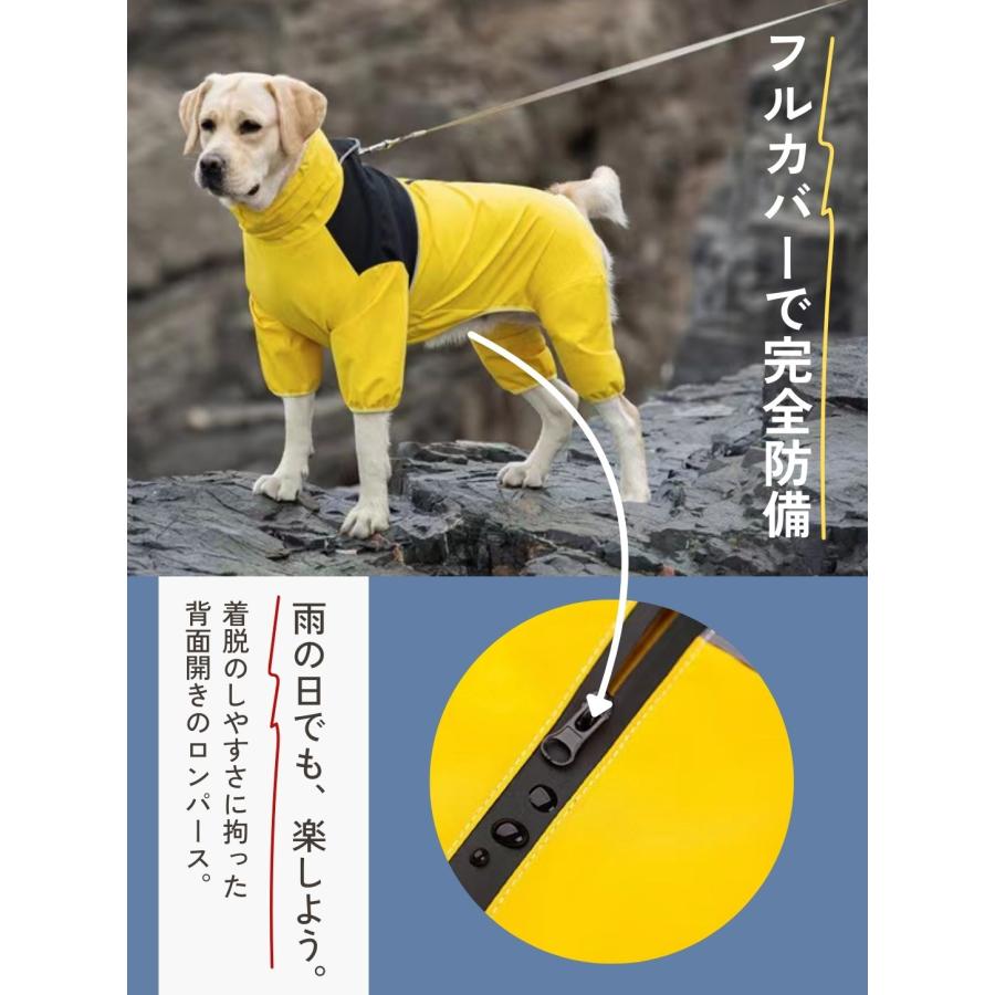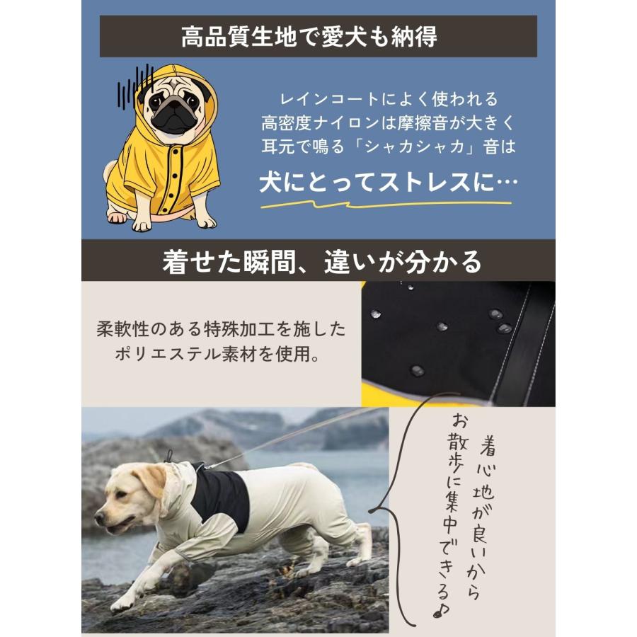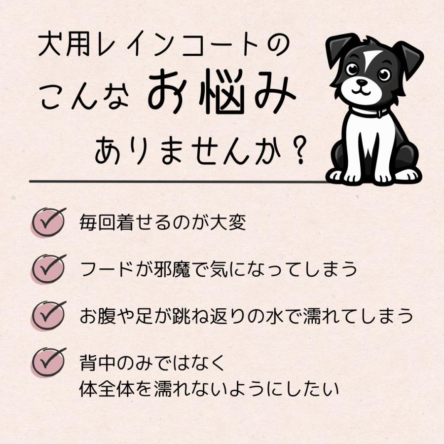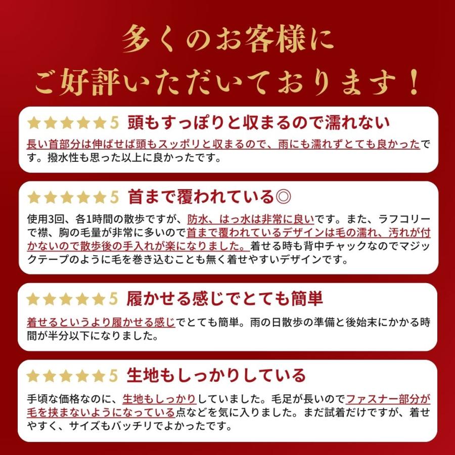 【ポイント】<br> ・フルカバー設計で足元までしっかりガードし、愛犬の体が濡れにくい<br> ・背中開きデザインで着せやすく、動きやすい仕様<br> ・ハイネック仕様で首元もしっかりカバーし、顔まわりの濡れを軽減<br> ・フードなしで視界を遮らず、ストレスフリーな着心地<br> ・上質な防水生地を使用し、快適な散歩をサポート<br>
