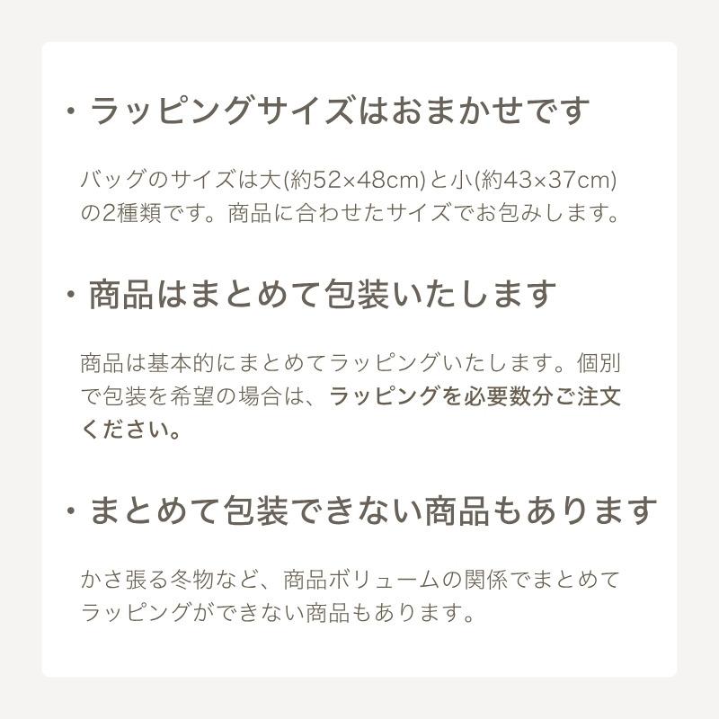 ラッピング希望の商品と一緒にご注文ください。※商品はまとめて包装いたします。(商品ボリュームの関係でまとめてラッピングができない商品もございます)※個別でラッピング希望の場合は必要数分ご注文ください。バッグのサイズは大(約52×48cm)と小(約43×37cm)の2種類です。商品に合わせたサイズでお包みします。