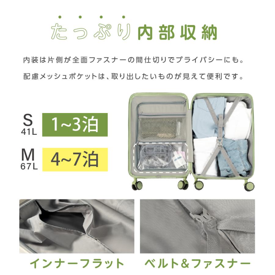 【TSAロック&大容量】ロックは、ダイヤル式を採用。鍵の持ち歩きが不要なので、紛失の心配がないのも魅力です。内装は両面開きのフロント側にファスナーカバーを装着したコンパートメント(仕切り)設計。2つの収納スペースに間仕切りを設けて、スーツケースを開けたときの荷崩れを予防します。