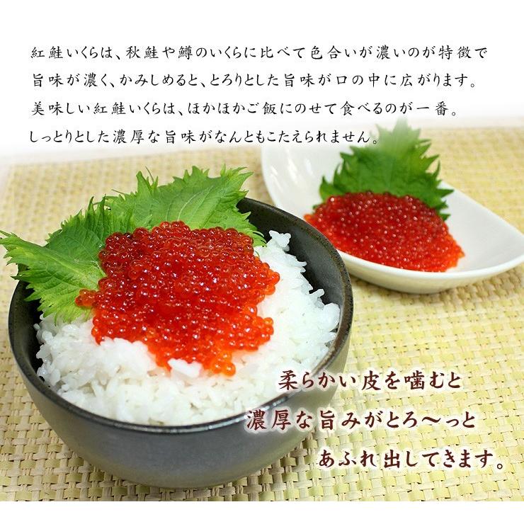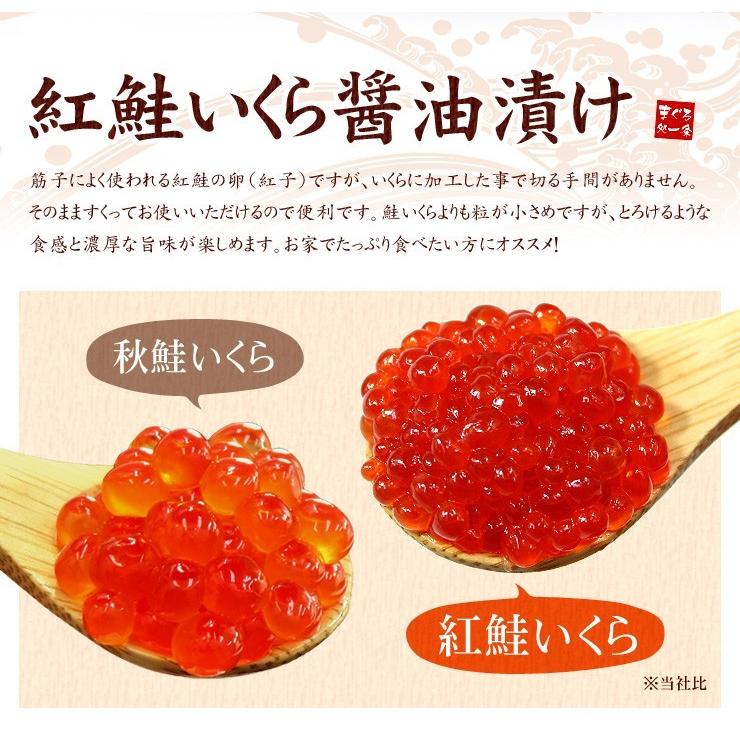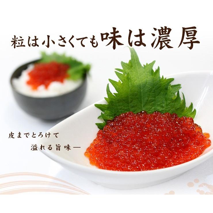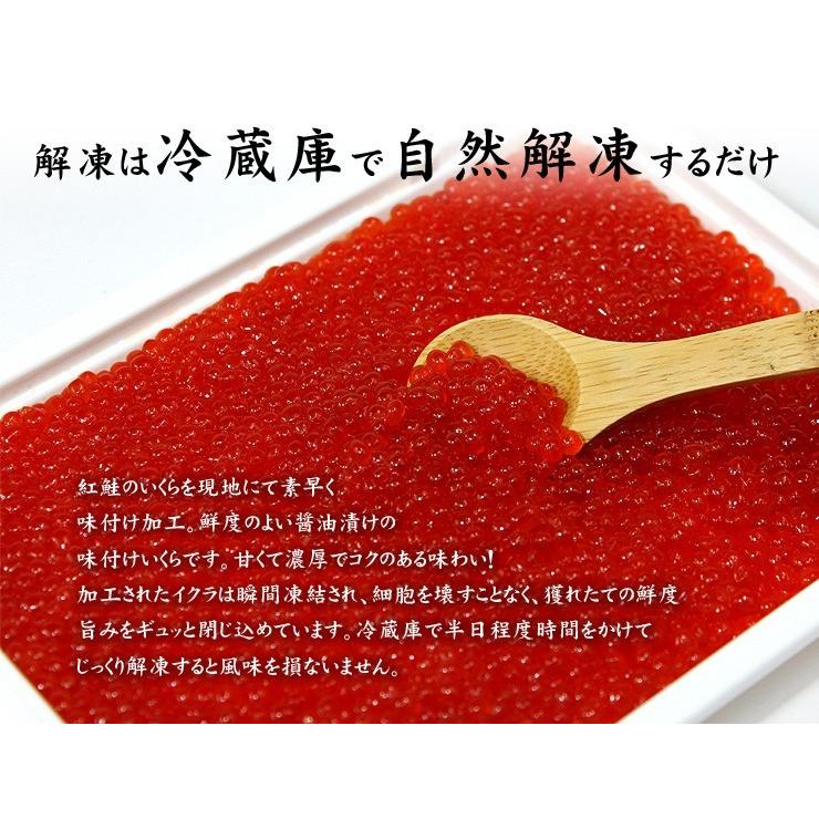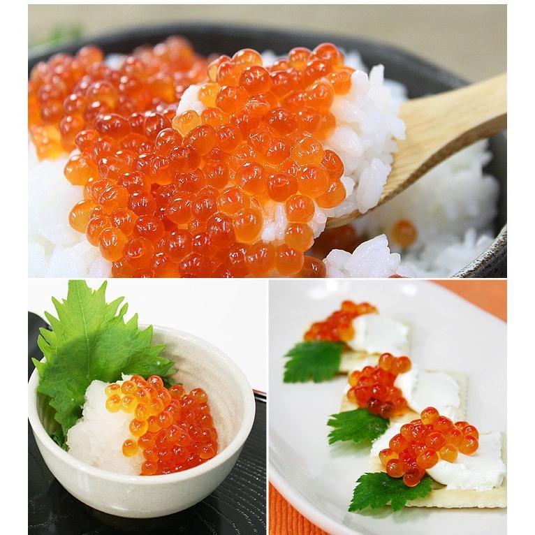 新鮮な紅鮭の卵を醤油漬けにしました。小粒ですが、ぷちっとした皮を噛むと、濃厚な旨みがとろ〜っとあふれ出してきます。熱々のご飯にたっぷりとのせてお召し上がりください。旨みを逃さぬよう、加工されたいくらは急速冷凍。味が濃く、旨みがたっぷりです。