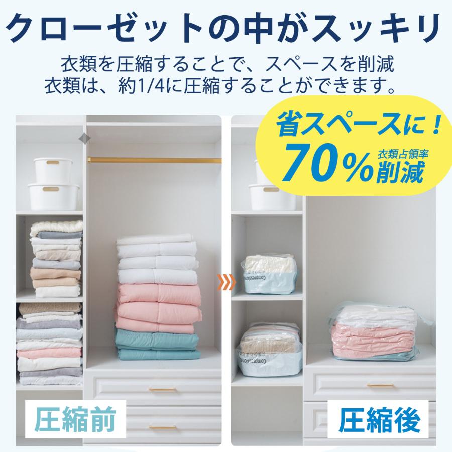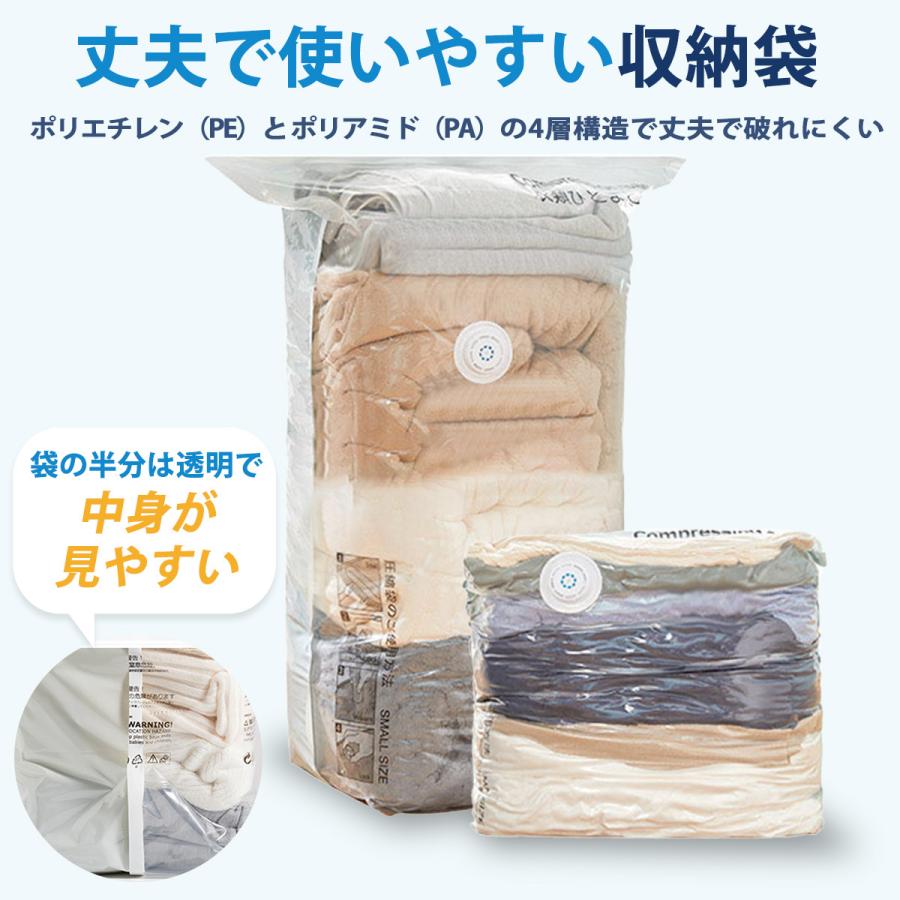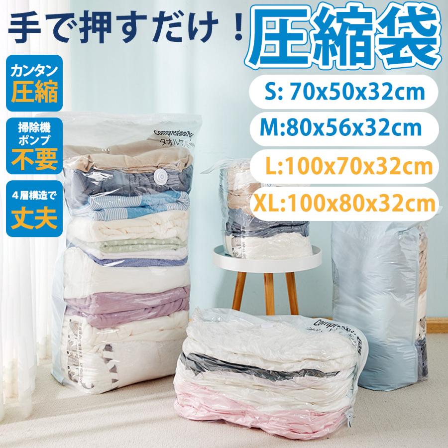 掃除機不要、ポンプ不要でカンタン!マチのある大型、大容量の布団、衣類用の圧縮袋になります。ポリエチレン、ポリアミドの4層構造となっており丈夫です。開口部は、専用スライダーで簡単に密閉。半面は透明となっており、中身が一目でわかります。●サイズ衣類用 Sサイズ 70x50x32cm Mサイズ 80x56x32cm布団用 Lサイズ 100x70x32cm XLサイズ 100x80x32cm