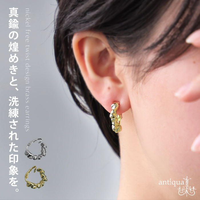 ◎メール便可!※詳細をPCサイトよりご購入前にご確認下さいませ。耳元にほどよい存在感を与える、ねじりデザインの真鍮製イヤリング。ニッケルフリーメッキ仕様で金属アレルギー対応。軽やかな着け心地で長時間の使用でも快適です。シルバーとゴールドの2色展開。クリップ式でピアスホールがなくても装着可能。デイリーからオフィス、ちょっとしたお出かけまで、幅広く活躍する一品です。