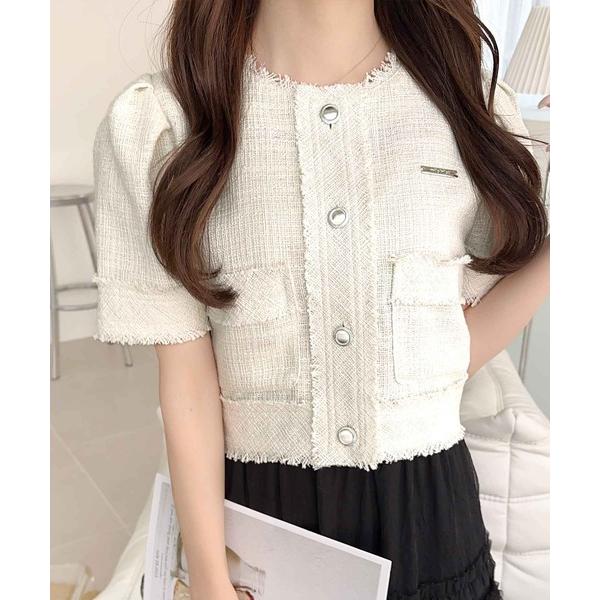 商品名:【mily bilet】きらめくツイードに、ときめきを。ロゴプレート使い半袖ラメ入りツイードジャケット
