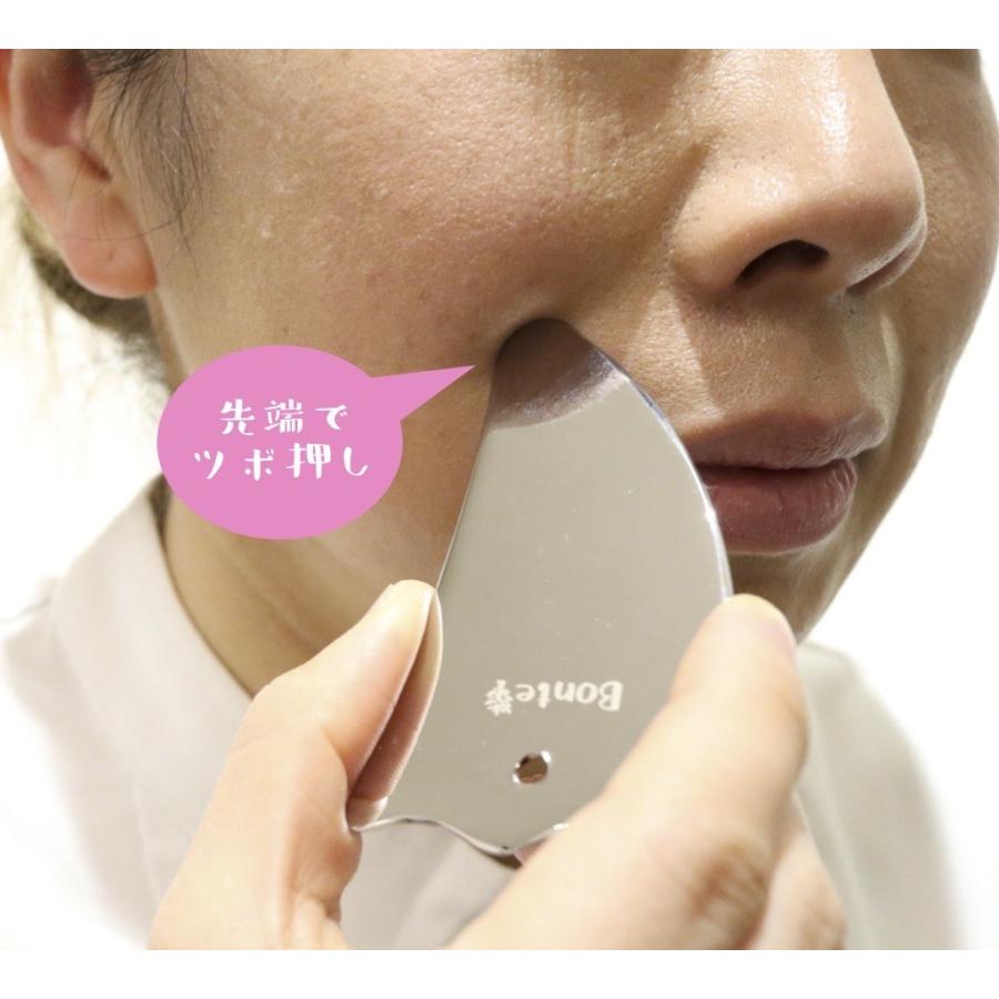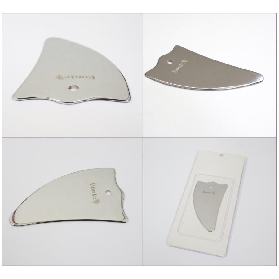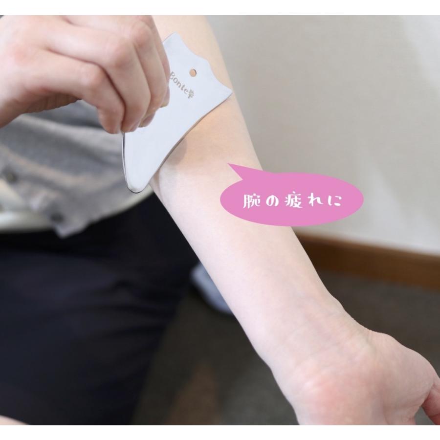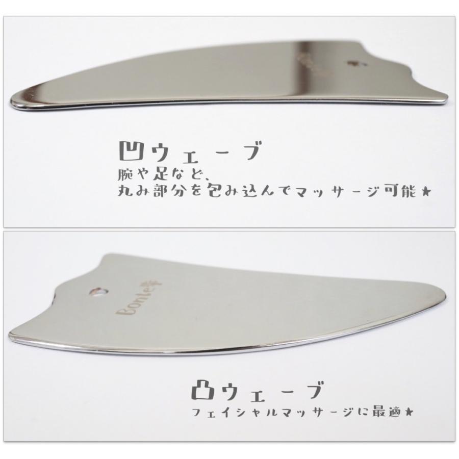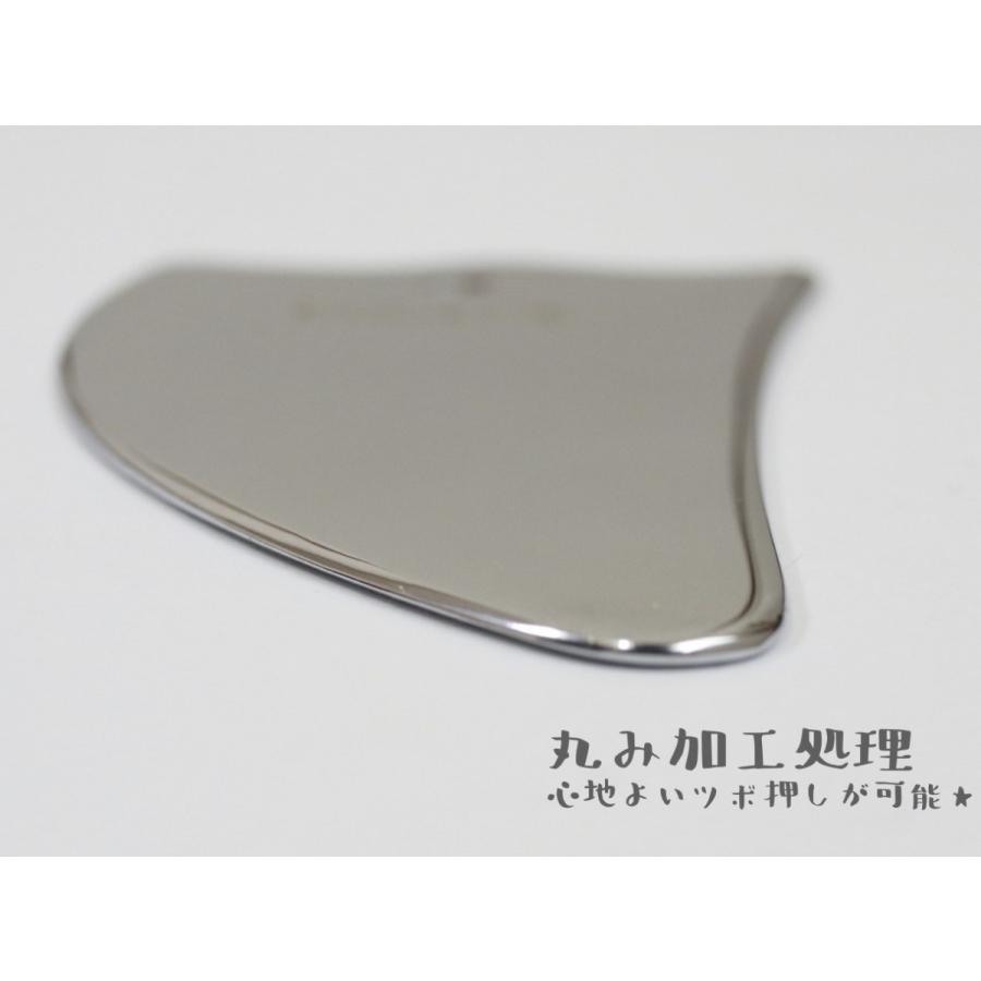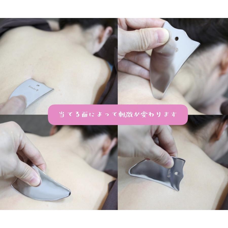 サイズ:約80mm(縦)×45mm(横)×1mm(厚み) 重量:約33g 素材:銅製(酸化防止のため表面のみクロムメッキ) 背中や肩への刺激、足のむくみ流し、フェイスマッサージなどに使用していただけます。流す手法で行う場合はオイルやクリームの上からご使用ください。? 本体の4方向で刺激のコントロールが可能です。側面のウェーブ部位では広い圧となり、波型部位と先端部位では鋭い刺激となります。 フェイスマッサージ(流すような手法)では、刺激量の少ないウェーブ部位での施術をお勧めします。先端部位などの鋭い刺激は、ツボ押しなどに適しています。鼻横などは先端部位でのツボ押しに適しています。? ※こちらの商品はかっさプレートでもあり、鍼灸師が使う接触鍼としても使えるよう設計しています。?接触鍼に近づけるため強度を保ちながら、可能な限り薄く仕上げています。それにより刺激が鋭くなります。切れることはありませんが、圧のかけすぎは怪我の元となりますので、くれぐれもお気をつけください。フェイスマッサージなどは、側面の広い面で優しい圧で十分な刺激が入ります。