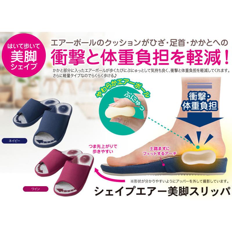 【商品名】 シェイプエアー美脚スリッパ 【個装サイズ 重量】 M:約D8.5×W26.0×H26.0+3.0(cm)/約215g L:約D9.0×W26.0×H27.0+3.0(cm)/約245g 【適応サイズ】 M:22.5〜23.5cm L:24.0〜25.0cm 【カラー】 ワイン、ネイビー 【材質】 本体生地:ポリエステル100% 底生地:ポリエステル80%・レーヨン20% エアーボール:塩化ビニル樹脂 中材クッション:ポリエチレン 中材・底部:EVA樹脂 【販売者】 株式会社ニーズ 【製造国】 中国 【JANコード】 【ワイン】M:4571414689205 L:4571414689212 【ネイビー】M:4571414689229 L:4571414689236
