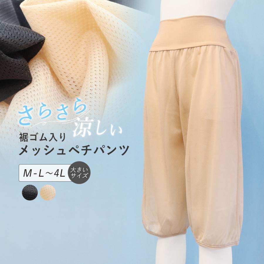 さらっと快適な穿き心地の 裾ゴムメッシュペチパンツです。ワイドパンツやガウチョパンツなどとペチパンツの裾を一緒に折り返すことで、裾の床つきを防いでくれます。通気性の良いメッシュ素材を使用し、汗ばむ季節のベタつきやムレをおさえてサラッと快適。ウエスト部分はフラットでボトムスに響きにくく、ごわつきや段差が気になりません。ドレスや浴衣のインナーとしてもおすすめです。