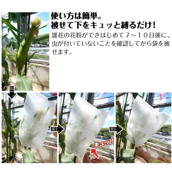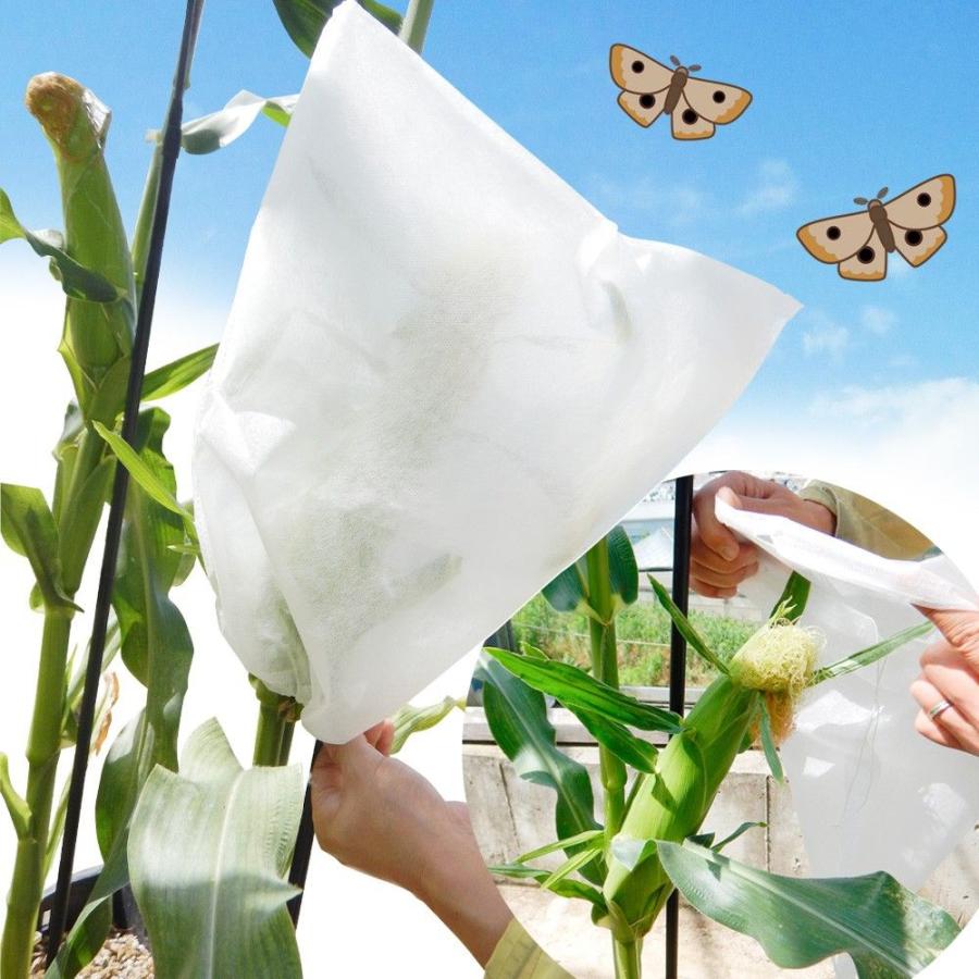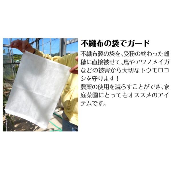 ●商品情報:受粉後に袋がけすることで、トウモロコシの天敵、アワノメイガや鳥等から大切な実をガード。不織布製で、網のように隙間がなくムレにくい! 雨にも強く、埃や紫外線からも果実を守ります。ワンタッチ紐付きで取付もラクラク!●サイズ:幅30×高さ40cm●入り数:1袋あたり10枚入●送料:たねと同送料です。1袋として計算してください。