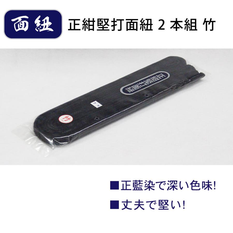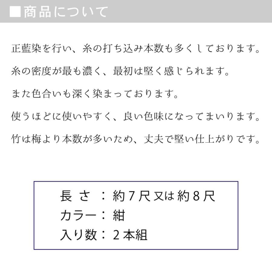剣道 防具 面紐特徴正藍染を行い、糸の打ち込み本数も多くしております。■糸の密度が最も濃く、最初は堅く感じられます。■また色合いも深く染まっております。■使うほどに使いやすく、良い色味になってまいります。■竹は梅より本数が多く丈夫で堅い仕上がりです。長さ:約7尺または約8尺グレード:竹カラー:紺入り数:2本組