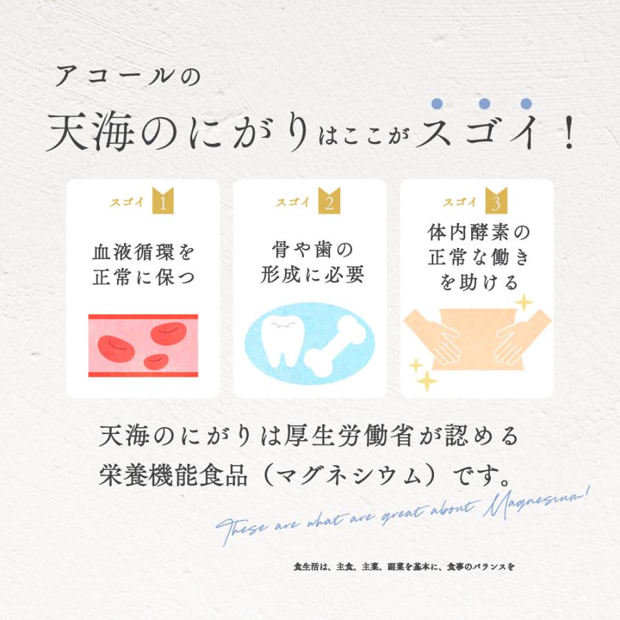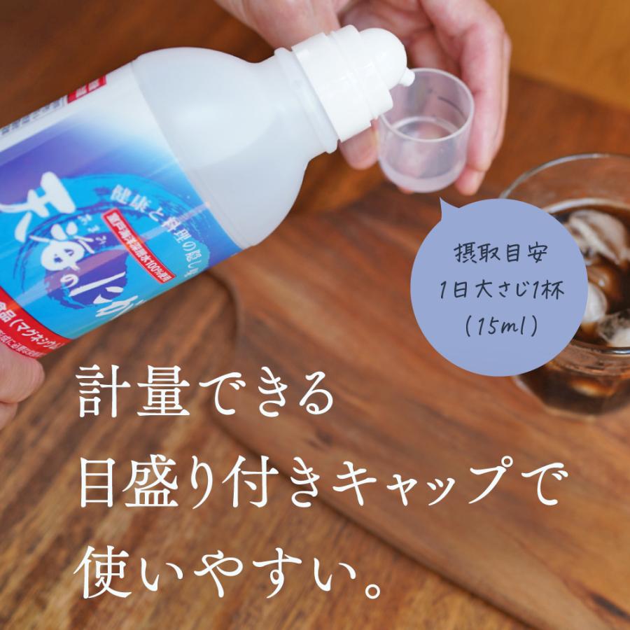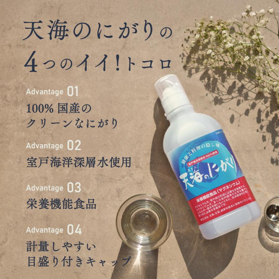 普段のお食事やお飲み物にプラスするだけでマグネシウム補給が叶う!さしすせそに続く第6の調味料!お料理全般に万能な「天海のにがり」ぜひ毎日の食卓にご活用ください。【栄養成分表示】 (15mlあたり)熱量・たんぱく質・脂質・炭水化物(0)、食塩相当量(0.126g)、マグネシウム(142.5mg)【原材料】海水(海洋深層水)(高知県室戸市)【保存方法】開封後は冷蔵庫で保存してください。