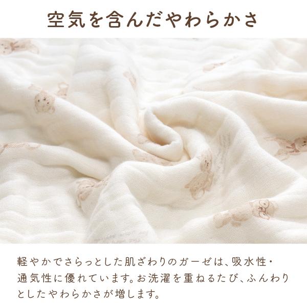 くしゅくしゅっとしたやわらかな肌触りの六重ガーゼ。 六重に重ねることで空気をたっぷり含んだガーゼはふんわりと柔らかくデリケートな赤ちゃんの肌を優しく包みます。 また、吸水性が高く汗をよく吸うのでさらっと気持ちいい使い心地です。