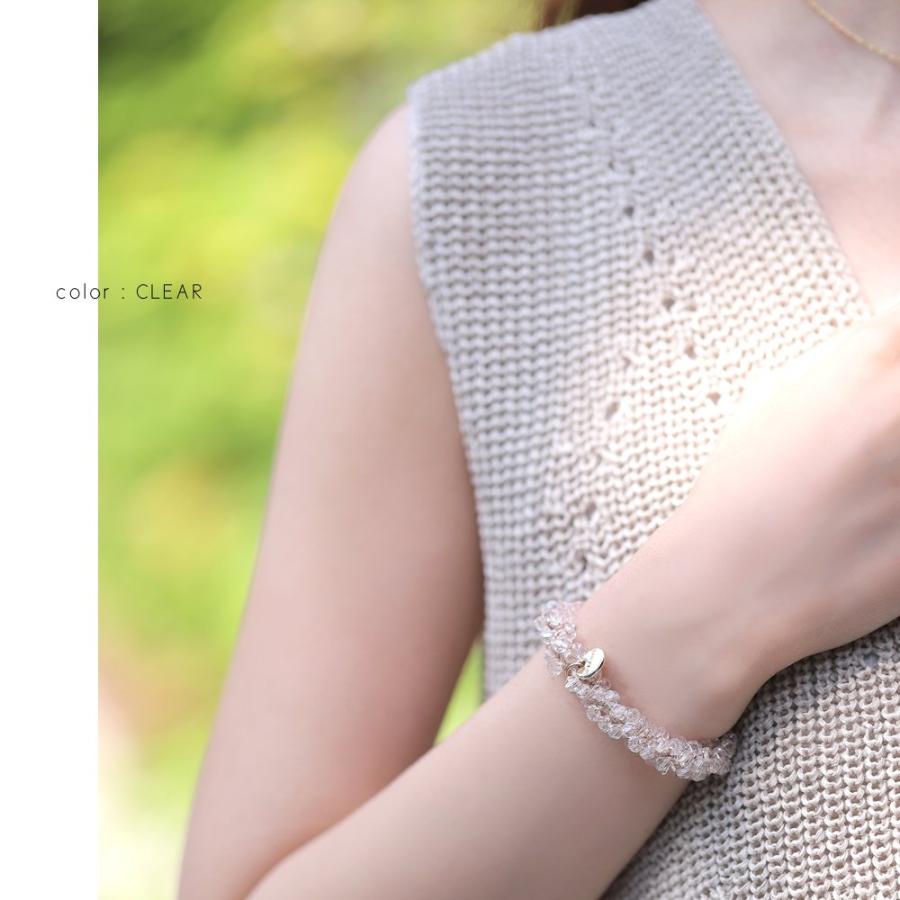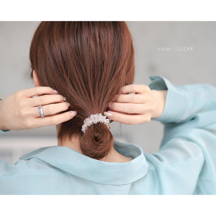 たっぷりのクリスタルビーズやパールを編み上げたヘアゴムは、動くたびに繊細な煌めきを放ち、女性らしい華やかな印象に仕上げてくれます。
