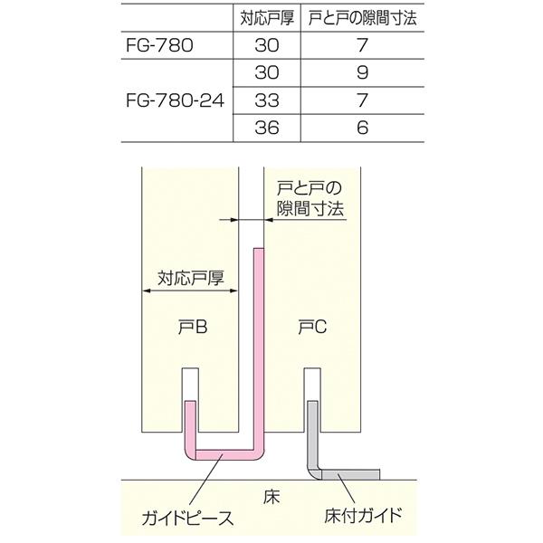 FG-780-24使用:扉の厚み30mmで戸と戸の隙間が9mmの場合、扉の厚み33mmで戸と戸の隙間が7mmの場合、扉の厚み36mmで戸と戸の隙間が6mmの場合
